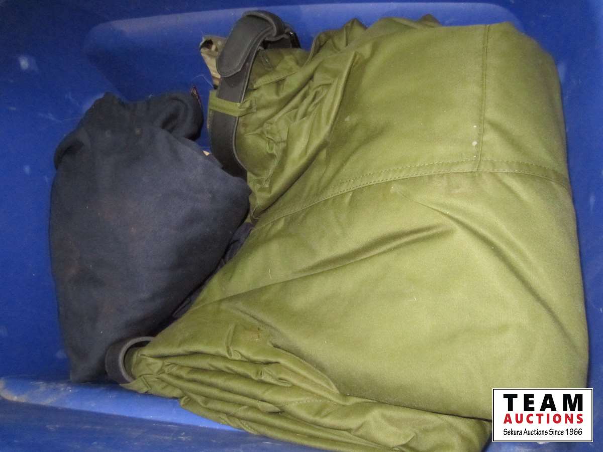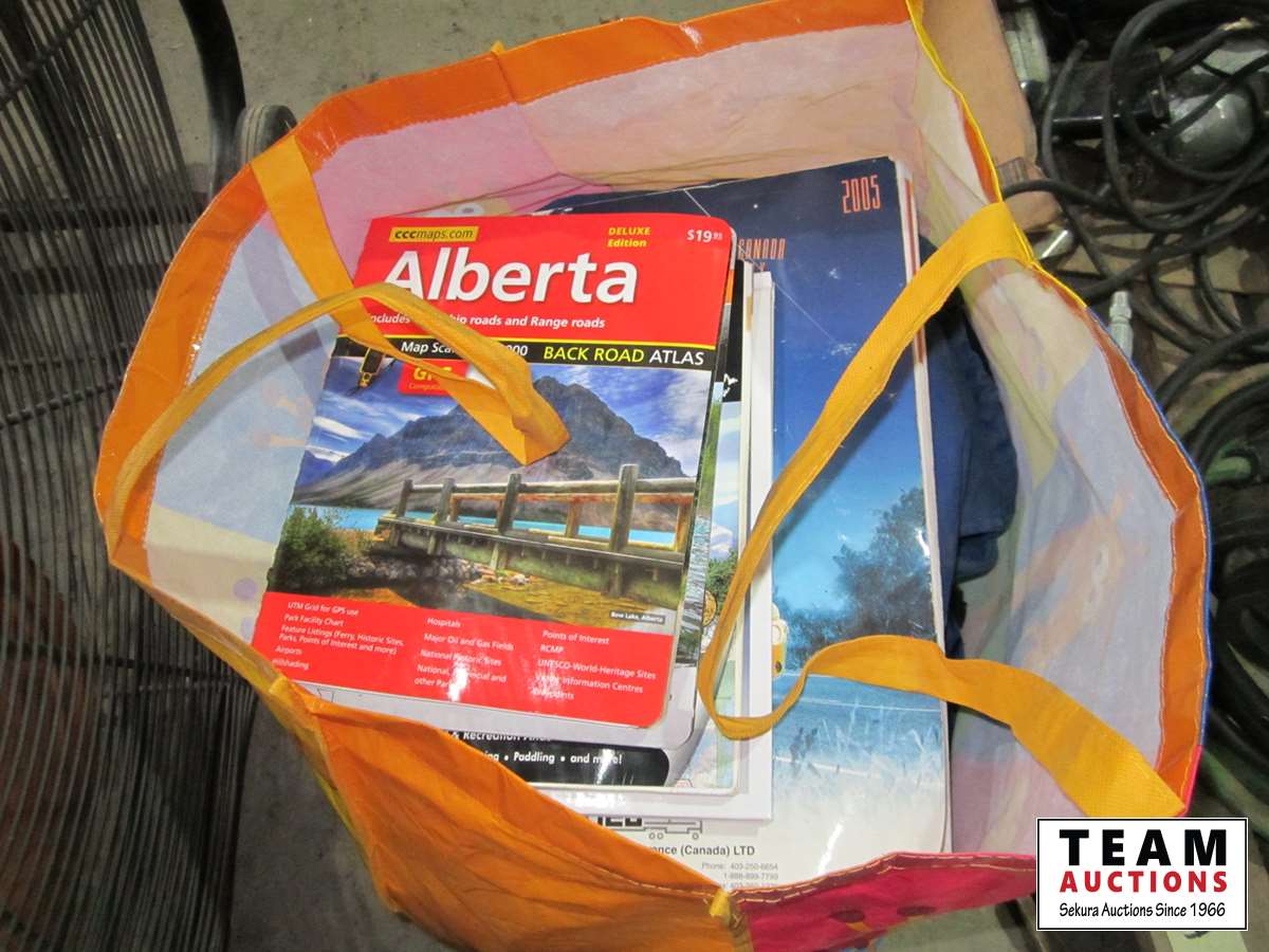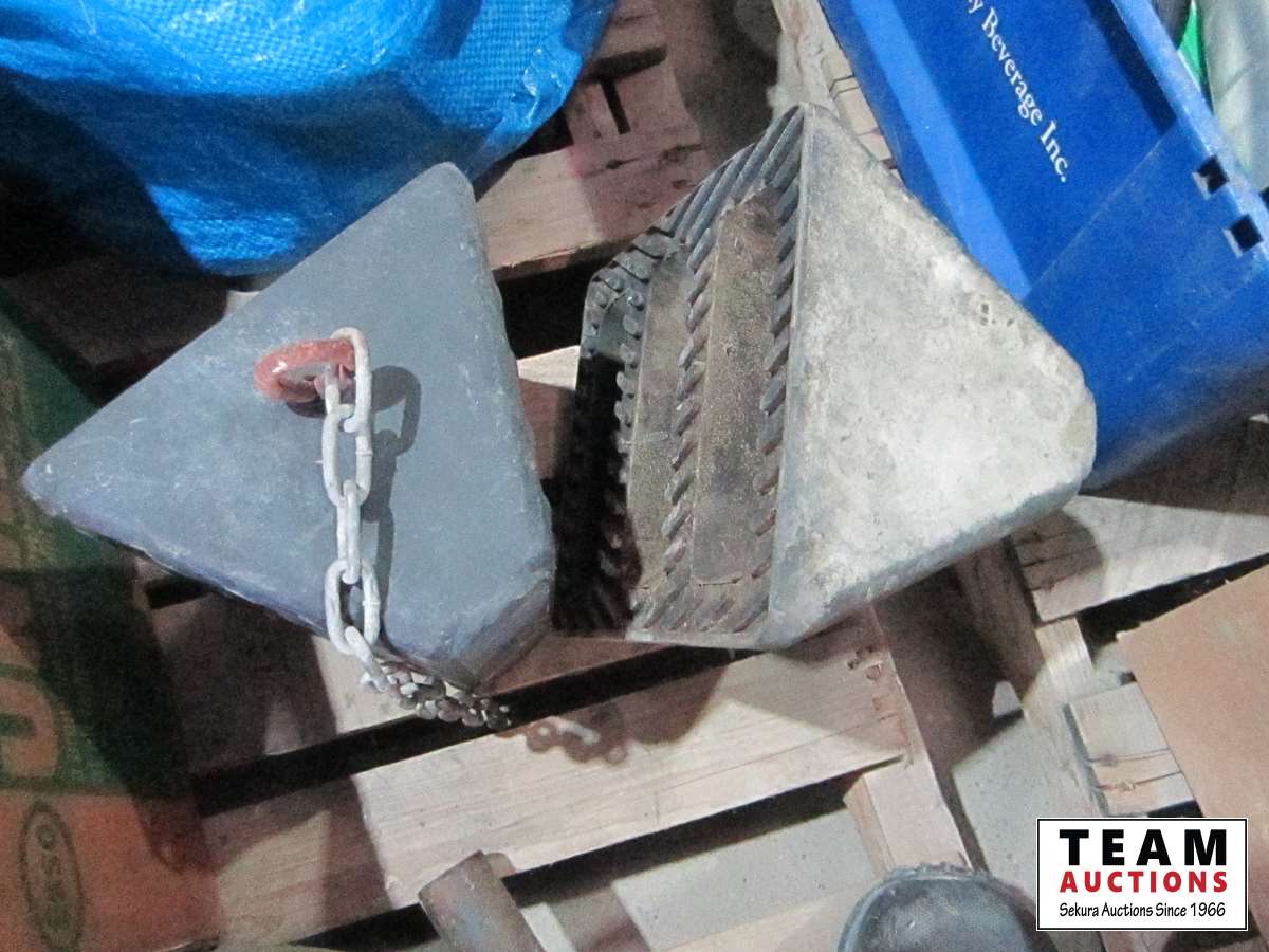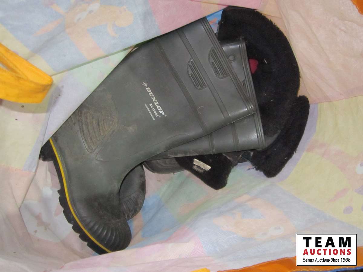 frost teeth for excavator bucket, rubber wheel chocks, box of Unirex grease, bag w/ map books misc., 2XL work jacket, tote w/clothing items, boots, misc.