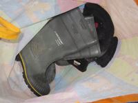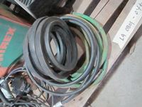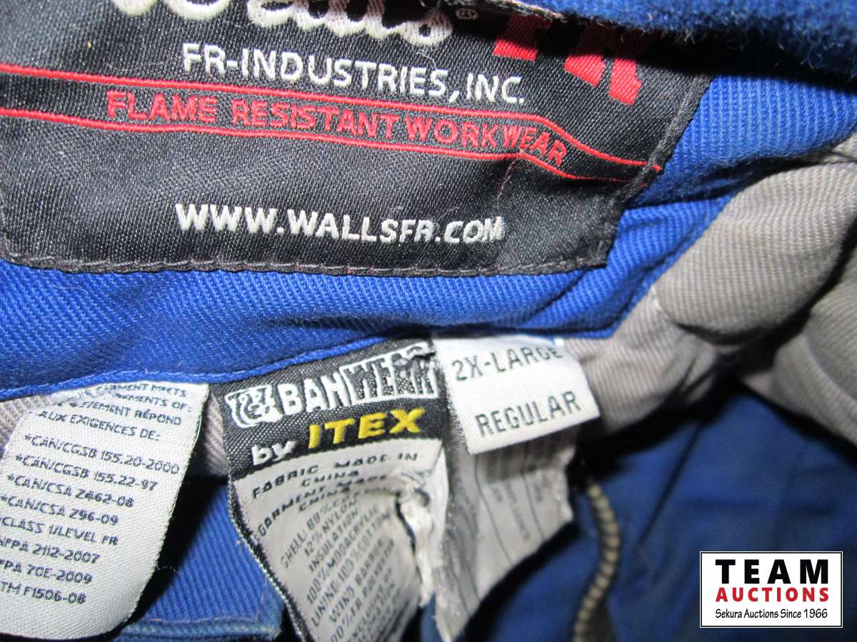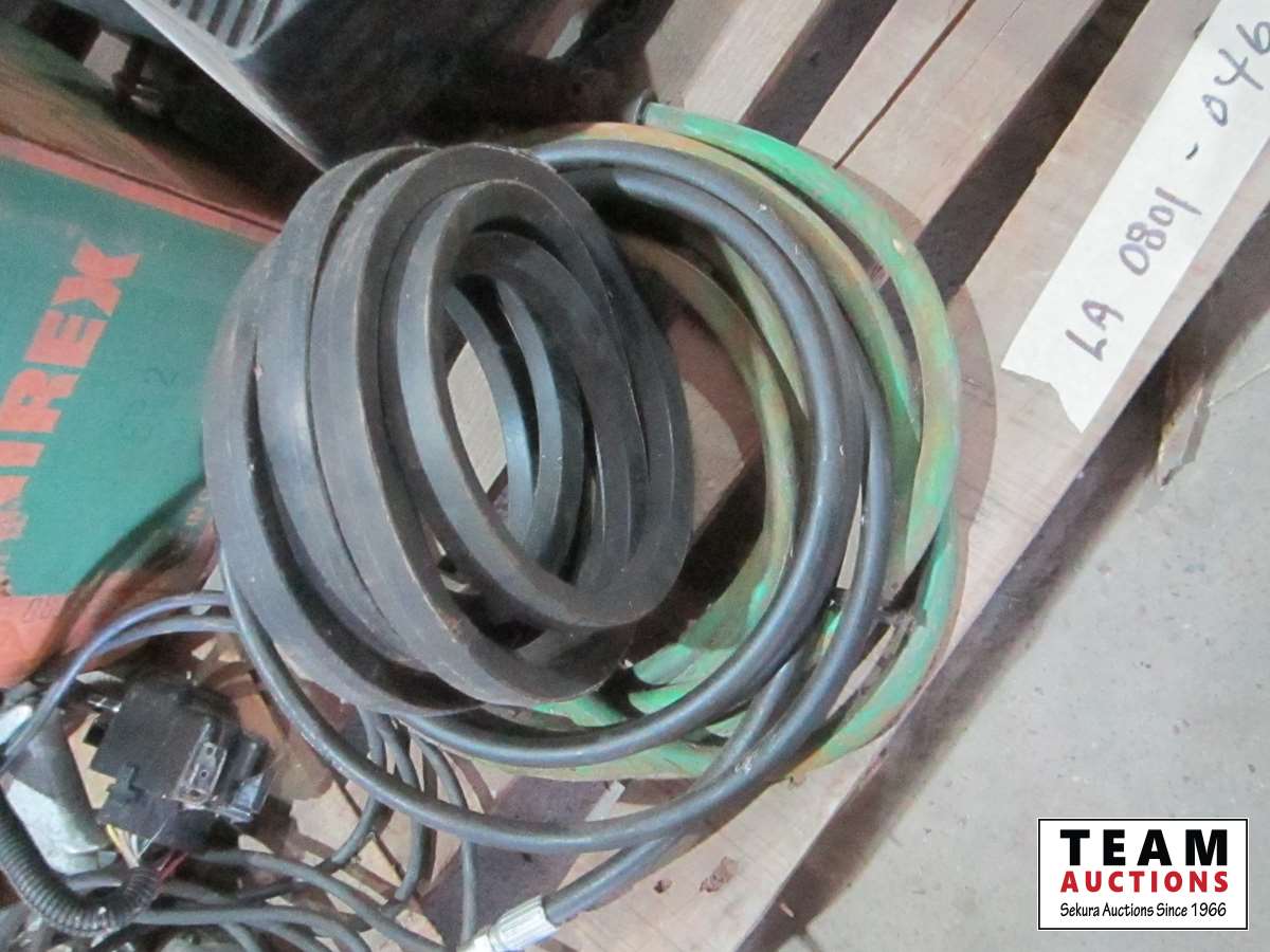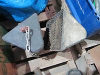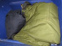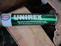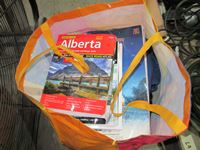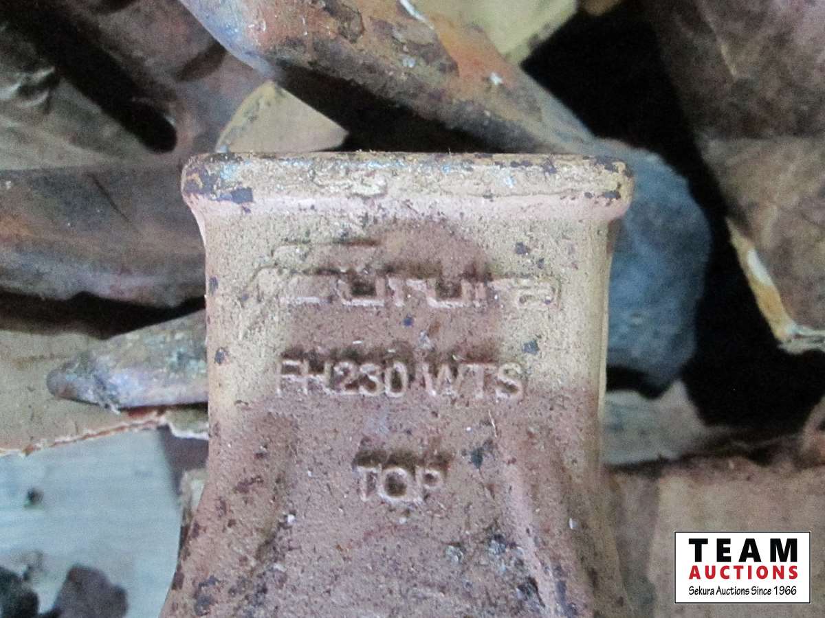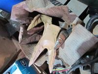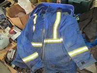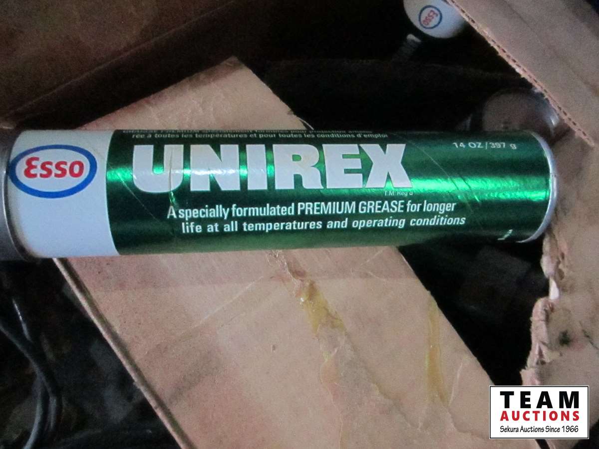 frost teeth for excavator bucket, rubber wheel chocks, box of Unirex grease, bag w/ map books misc., 2XL work jacket, tote w/clothing items, boots, misc.