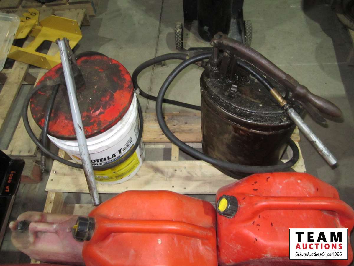 (2) grease pumps, various gasoline cans