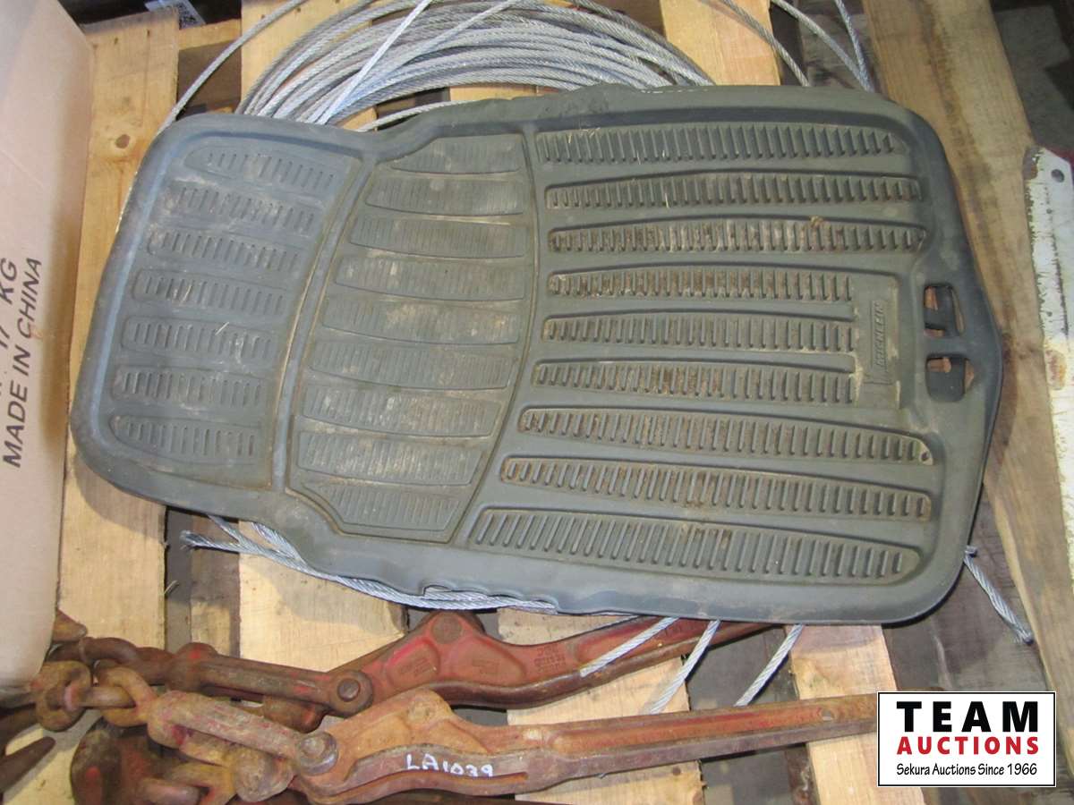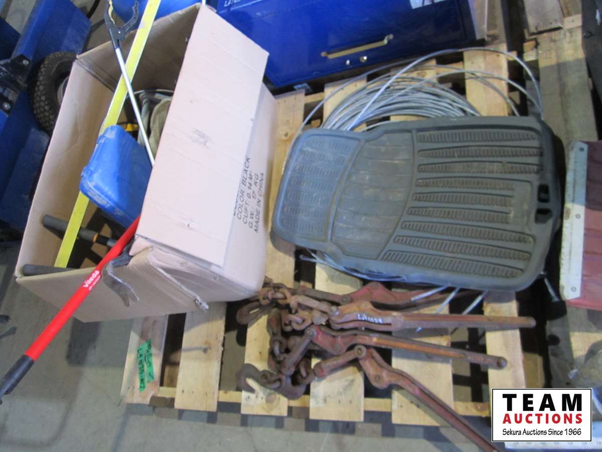 load binders, car floor matts, misc. cable/wire, drill bit/socket set, box w/misc. tools, hedge trimmers, tape measure, 2in1 nailer, misc.