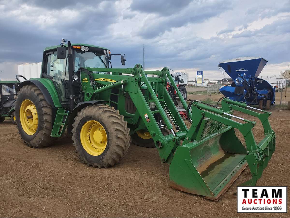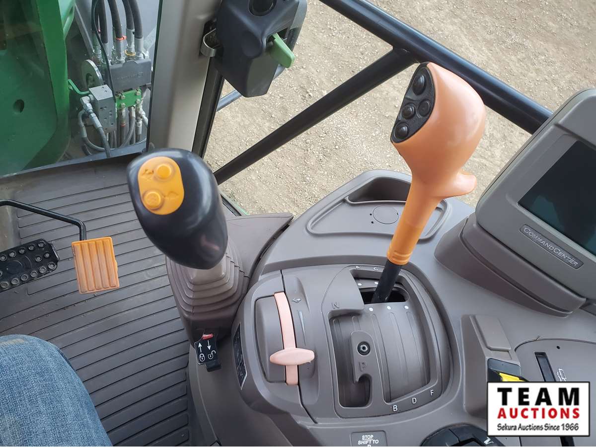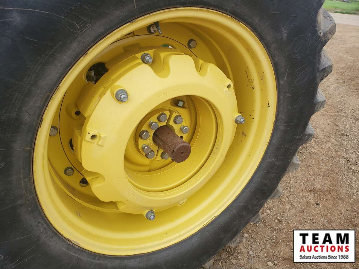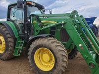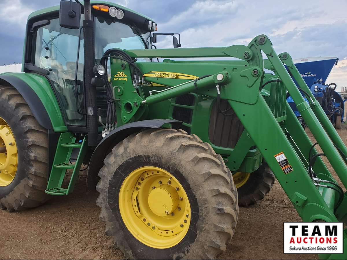 JD 741 loader, bucket, grapple, joystick, AutoQuad Plus partial powershift transmission, LHR, cab, heat, air, 540/1000 PTO, 3 pt, (3) rear sets hydraulic outlets, 420/85R28 front & 520/85R38 rear rubber, 3570 hrs