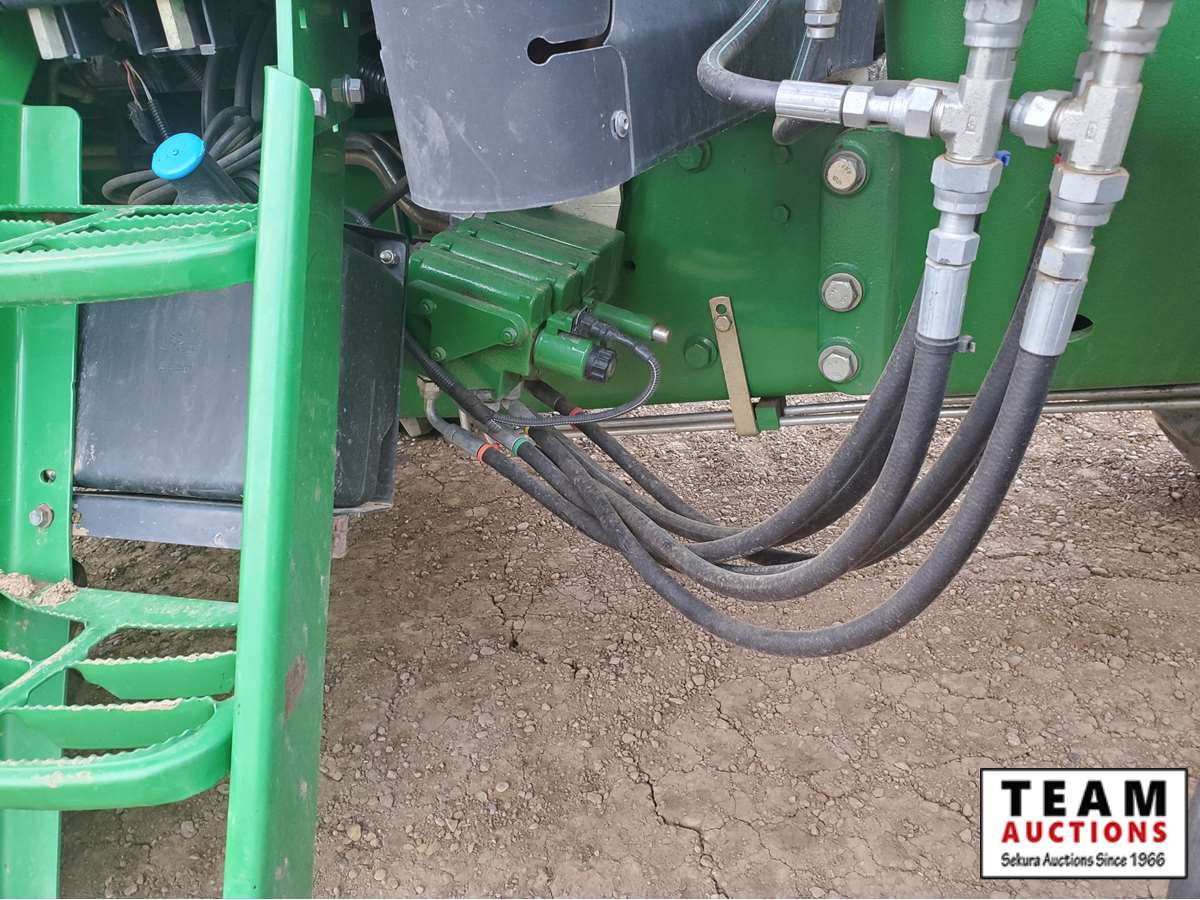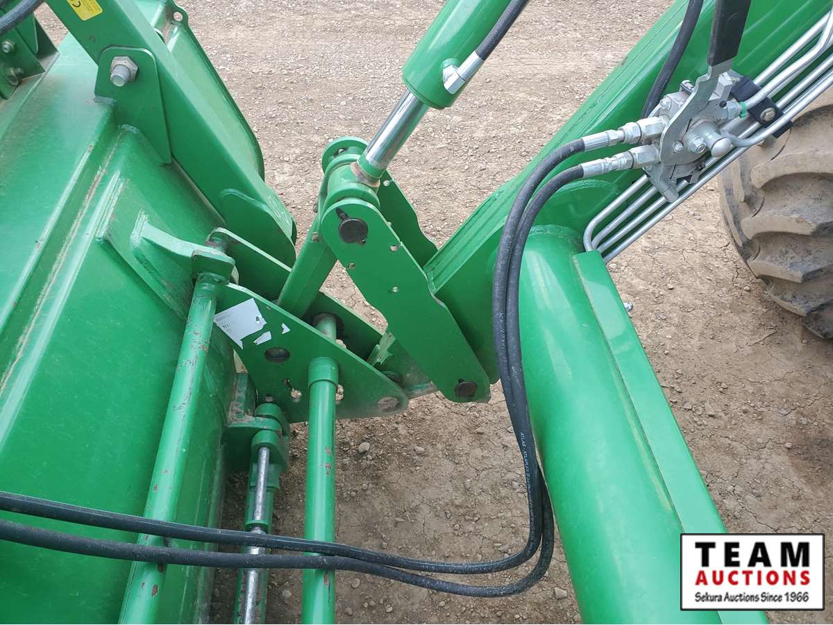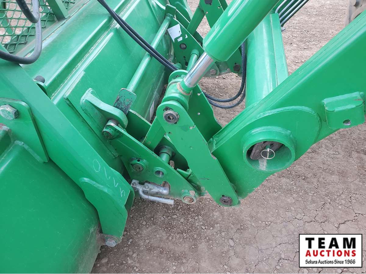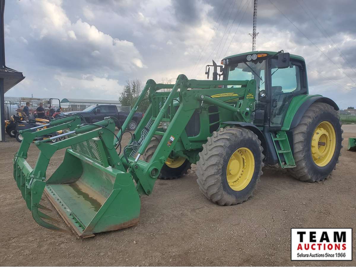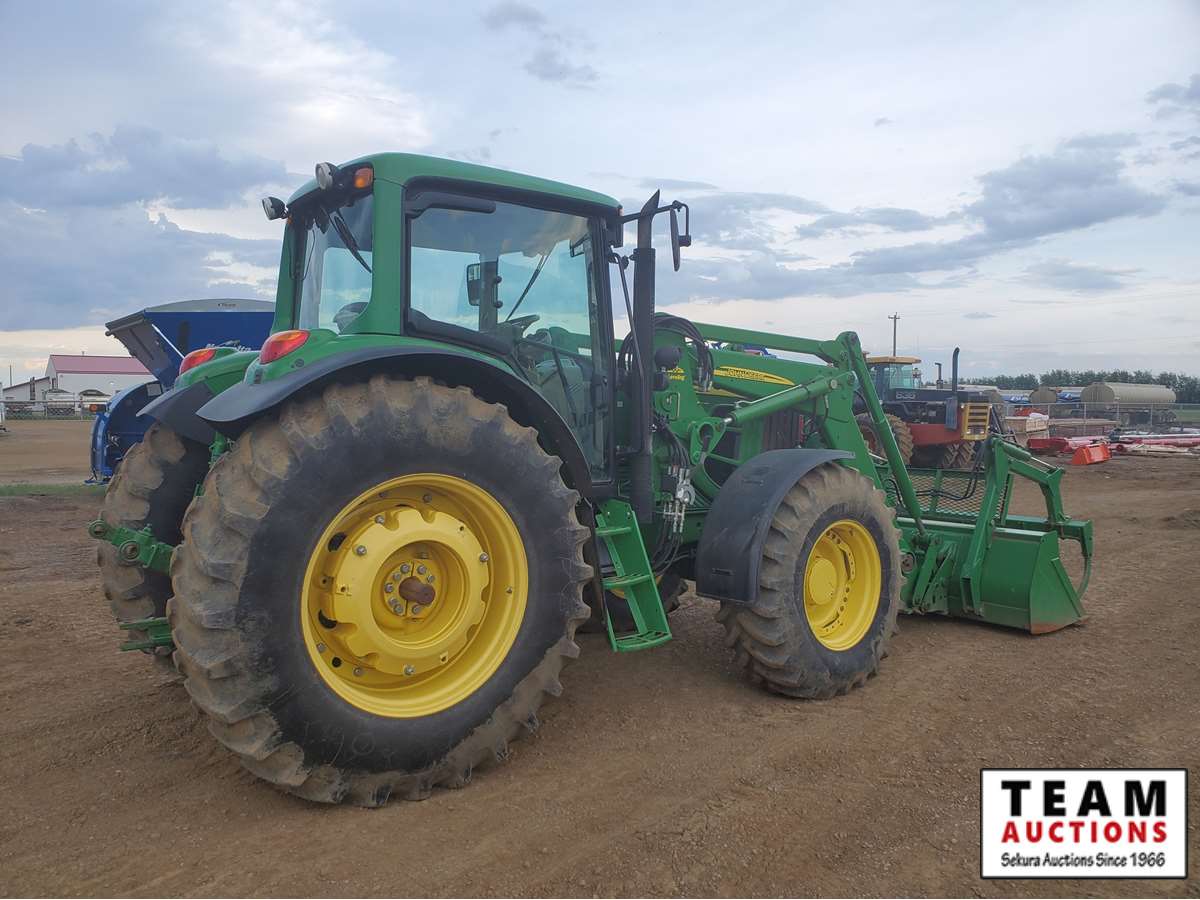 JD 741 loader, bucket, grapple, joystick, AutoQuad Plus partial powershift transmission, LHR, cab, heat, air, 540/1000 PTO, 3 pt, (3) rear sets hydraulic outlets, 420/85R28 front & 520/85R38 rear rubber, 3570 hrs