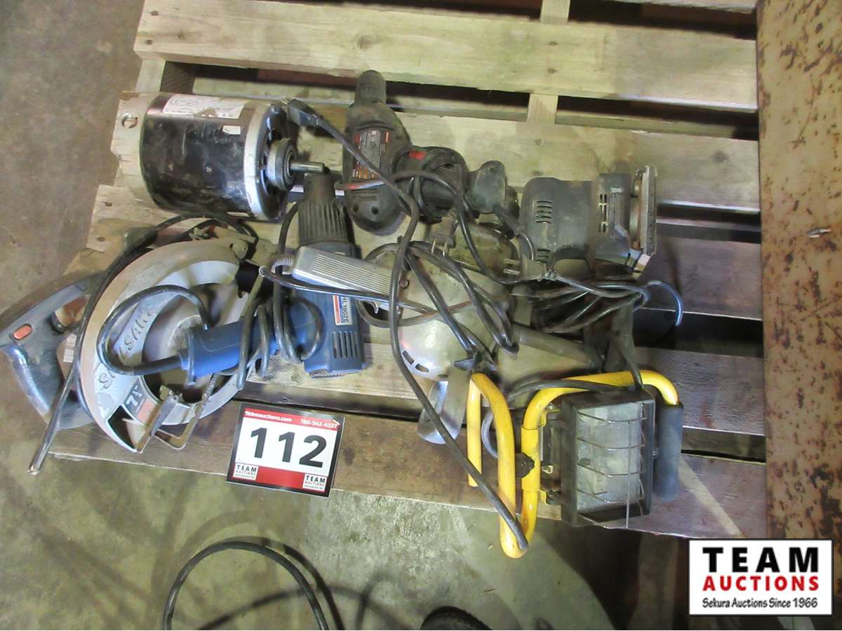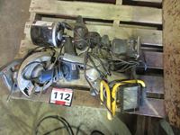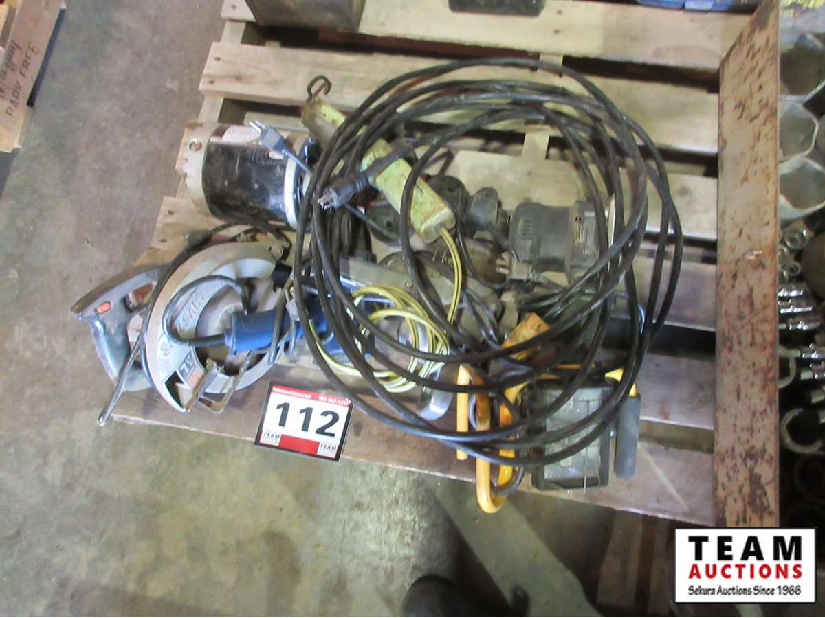 assorted power tools, trouble light, work lights, cords, furnace fan motor