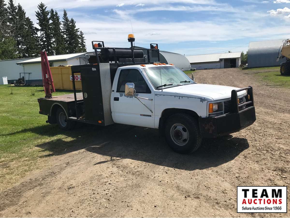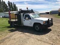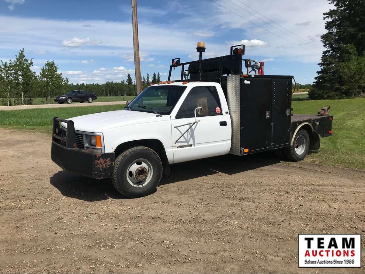 V8 gas engine, 5 speed manual transmission, deck with tool cabinets, truck engine driven air compressor,235/85R16 duals, 210,619 kms