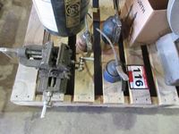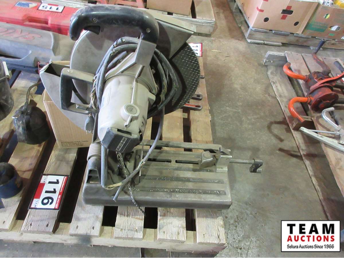 B&D 14" metal chop saw, (3) oiler cans, 4 way drill press vice, pail of Reddy rod