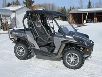 Rotax 1000 cc engine, high & low range with reverse, front winch, 1/2 windshield, roll over canopy, tilt box, dual after market exhaust (original exhaust comes with machine), full aluminum skid plate, aluminum guards for front tie rods, air ride suspension with built in air compressor, radio, navigation system, 27 x 9R14 front & 27 x 11R14 rear Maxxis Big Horn rubber, 1710 kms, 170 hrs