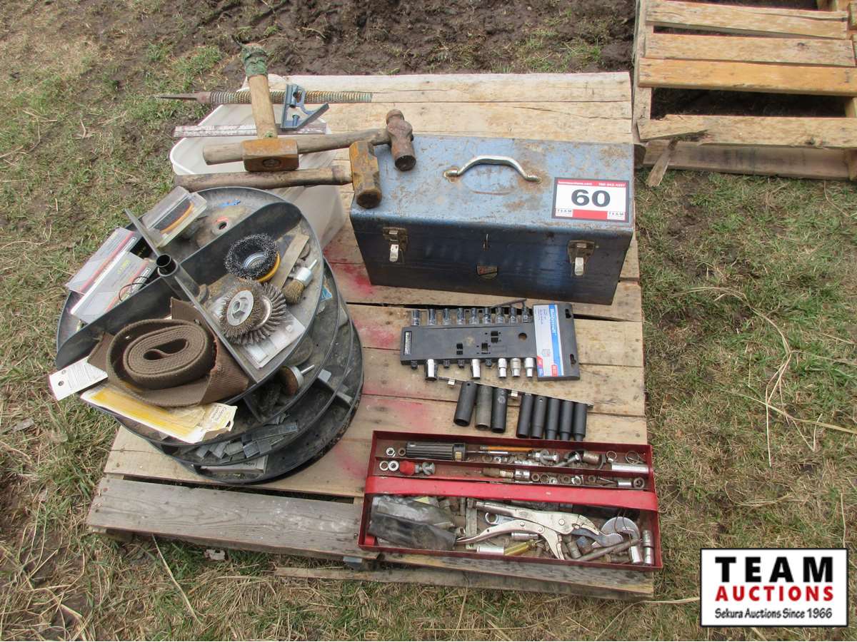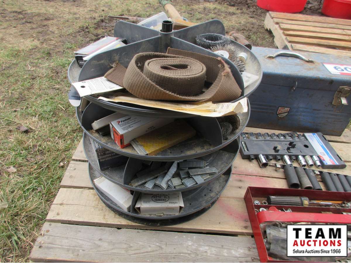 rotating tray full of misc hardware, tool kit with sockets & pail of hammers