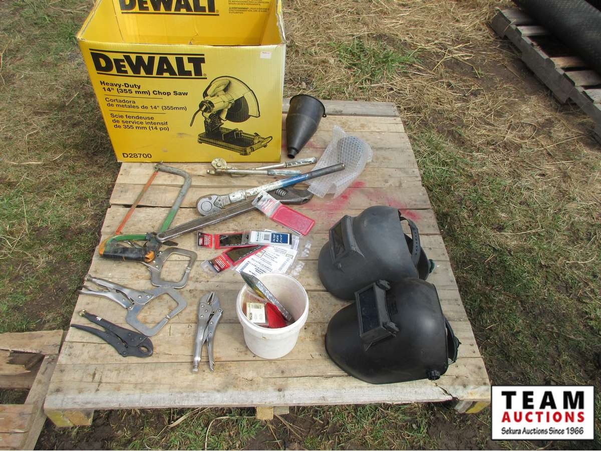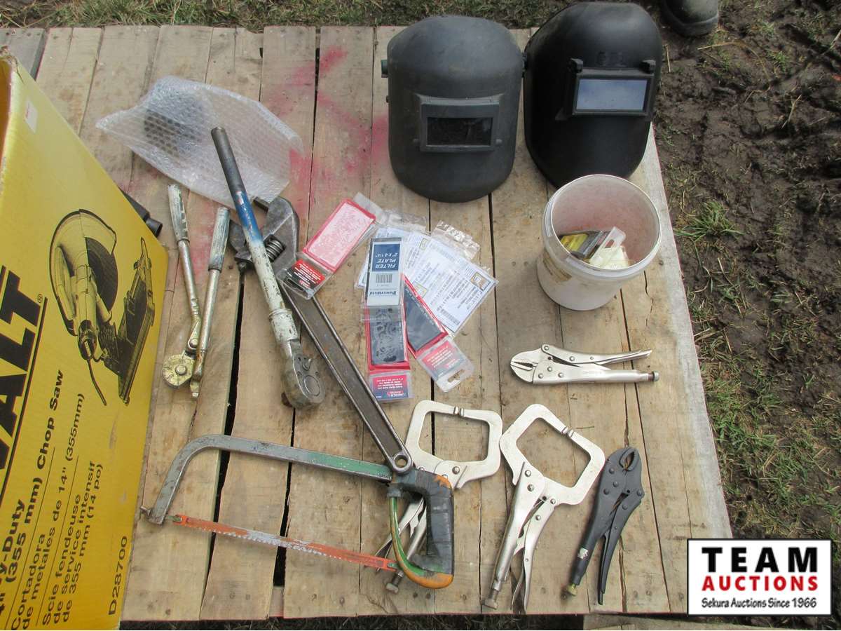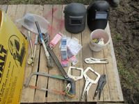 (2) welding helmets, vise grips, crescents, hacksaw, lenses & assorted tools