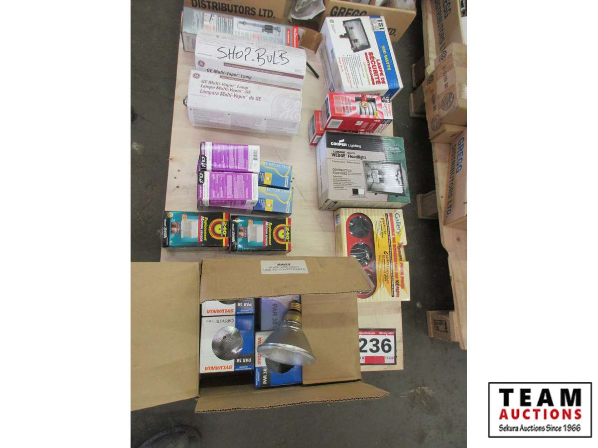 bulbs, motion sensors, shop bay light bulbs, (1) 8' fluorescent bulbs, (1) 4' fluorescent bulbs,