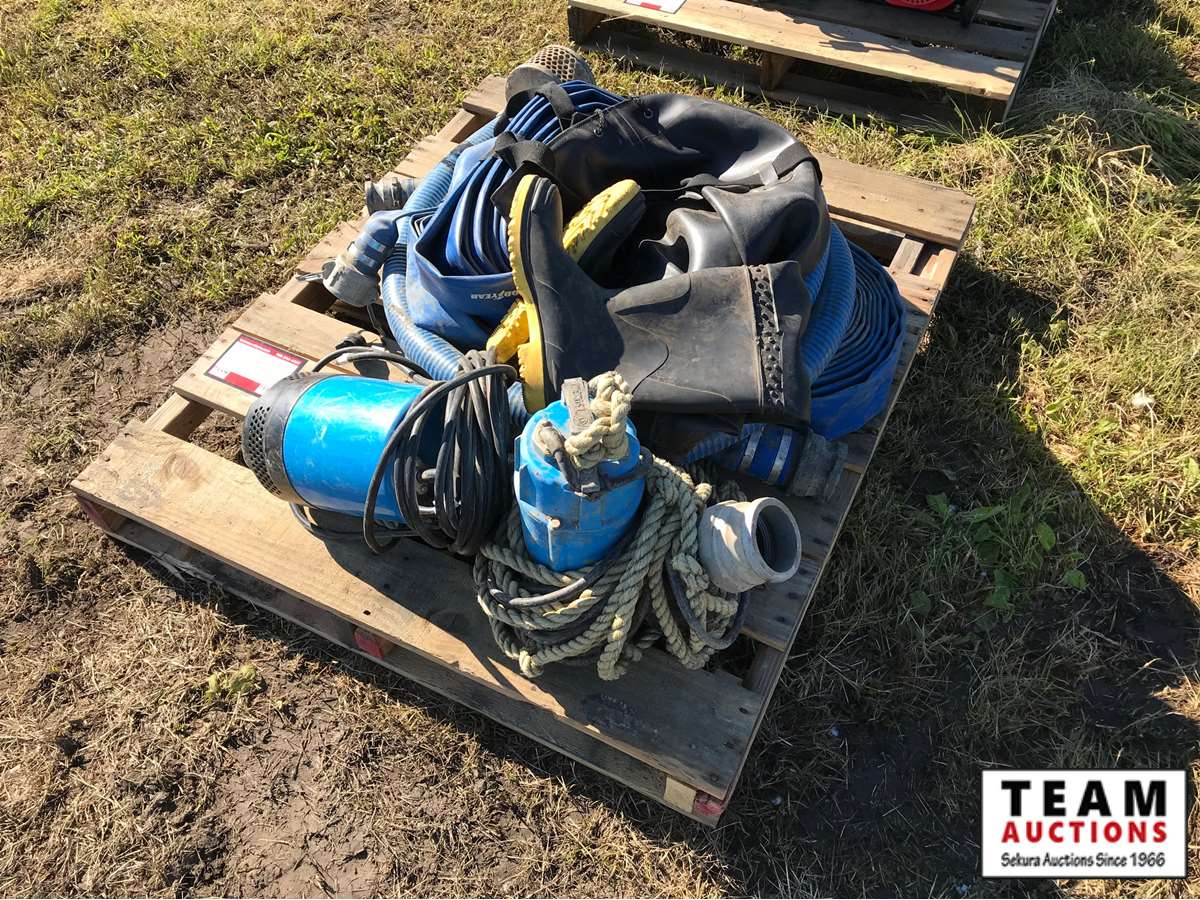 (1) 2" submersible pump, (1) 3" submersible pump, hip waders (size 10)