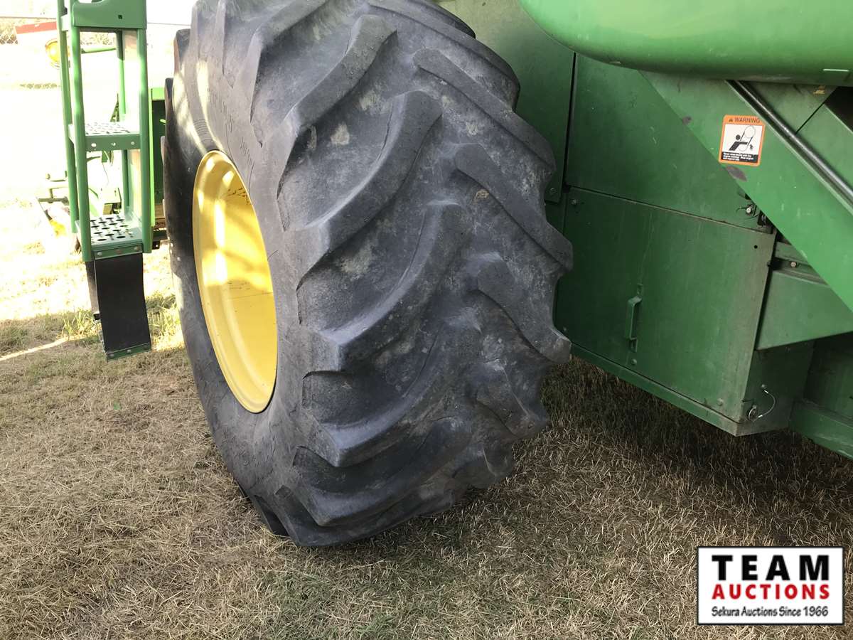 2003 914P pickup header s/n H00914W695200, reverser, VSR, auto HHC, F&A, 19 ft auger, chaff spreader, fine cut chopper, 800/65R32 F, 16.9R26 R, 3987 sep hrs showing, 5764 hrs