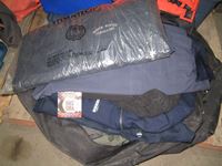 Amoco survival kit, blue tote with some men's clothing size 40 pants Win-River slippers, shirt 18.5" collar, duffle bag w/red vest Mustang floating survival jacket, duffle bag w/various coveralls & clothing items pants 44 x 30, shirts 2XL & more