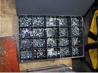 blue parts bins, yellow grey black container w/various screws & bolts, orange napco container w/various screws, grey container SAE NC bolts, blue container for holding hardware