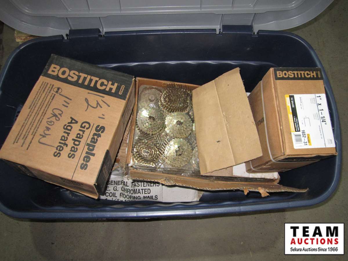 boxes of 1 1/2" staples & 1 1/4" staples w/ 1" crown, Boxes w/coils of roofing nails