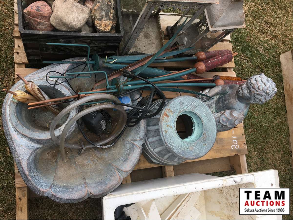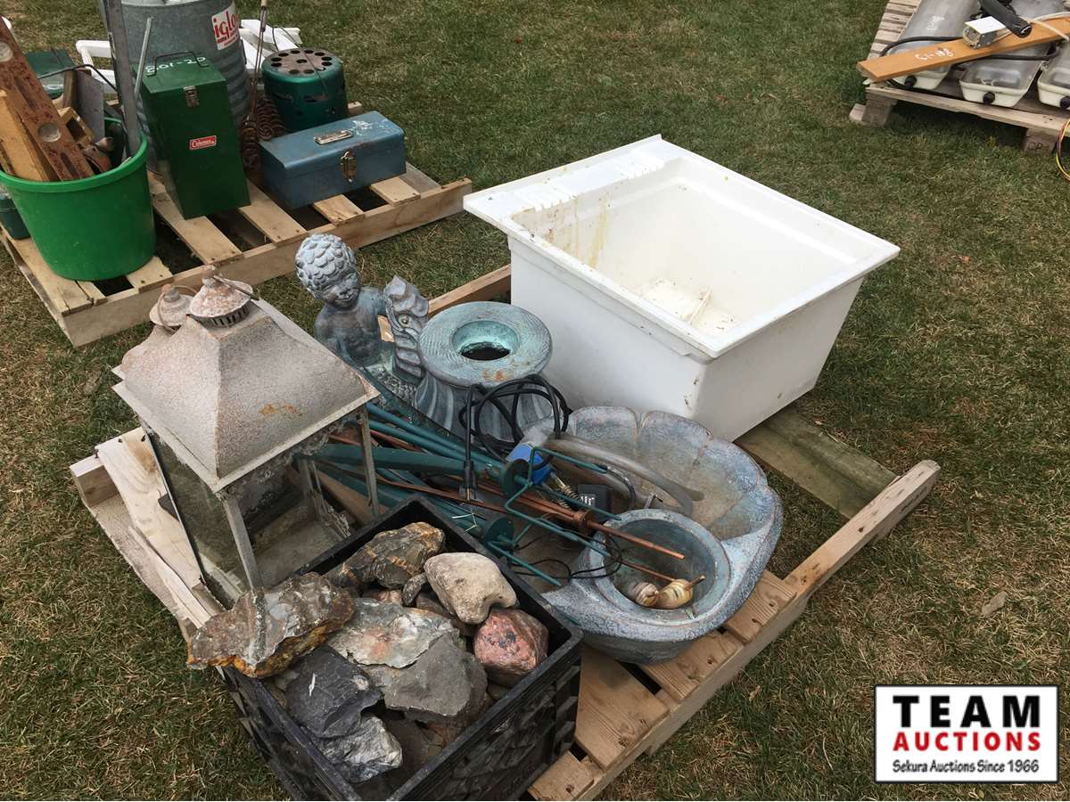 water fountain, poly sink, rocks, lanterns and misc items