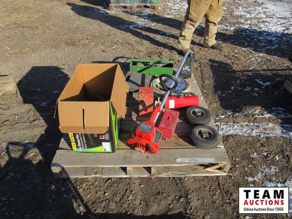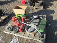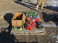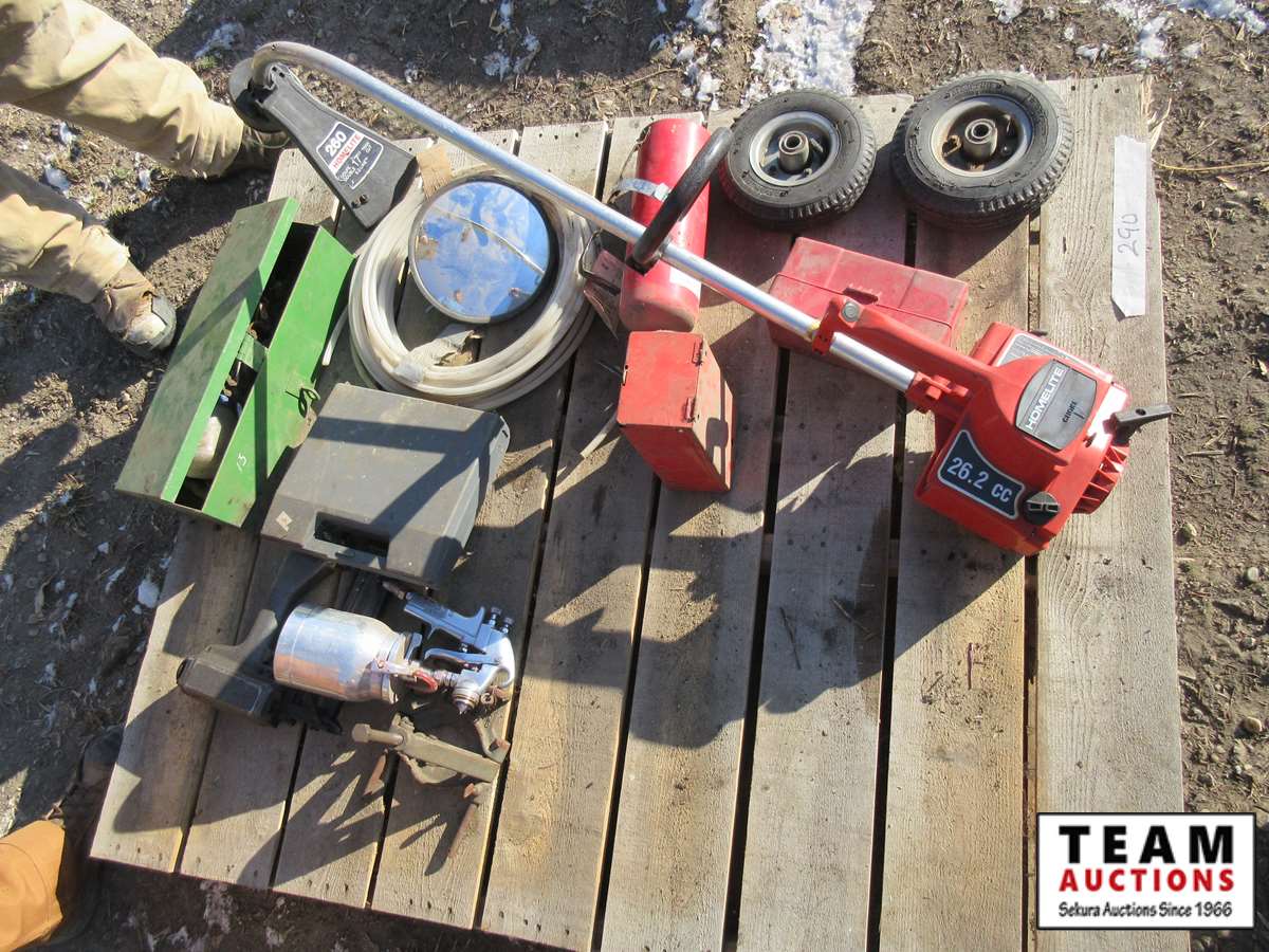 Homelite trimmer, fire extinguisher, paint sprayer, small tires, brad nailer, truck flares, misc