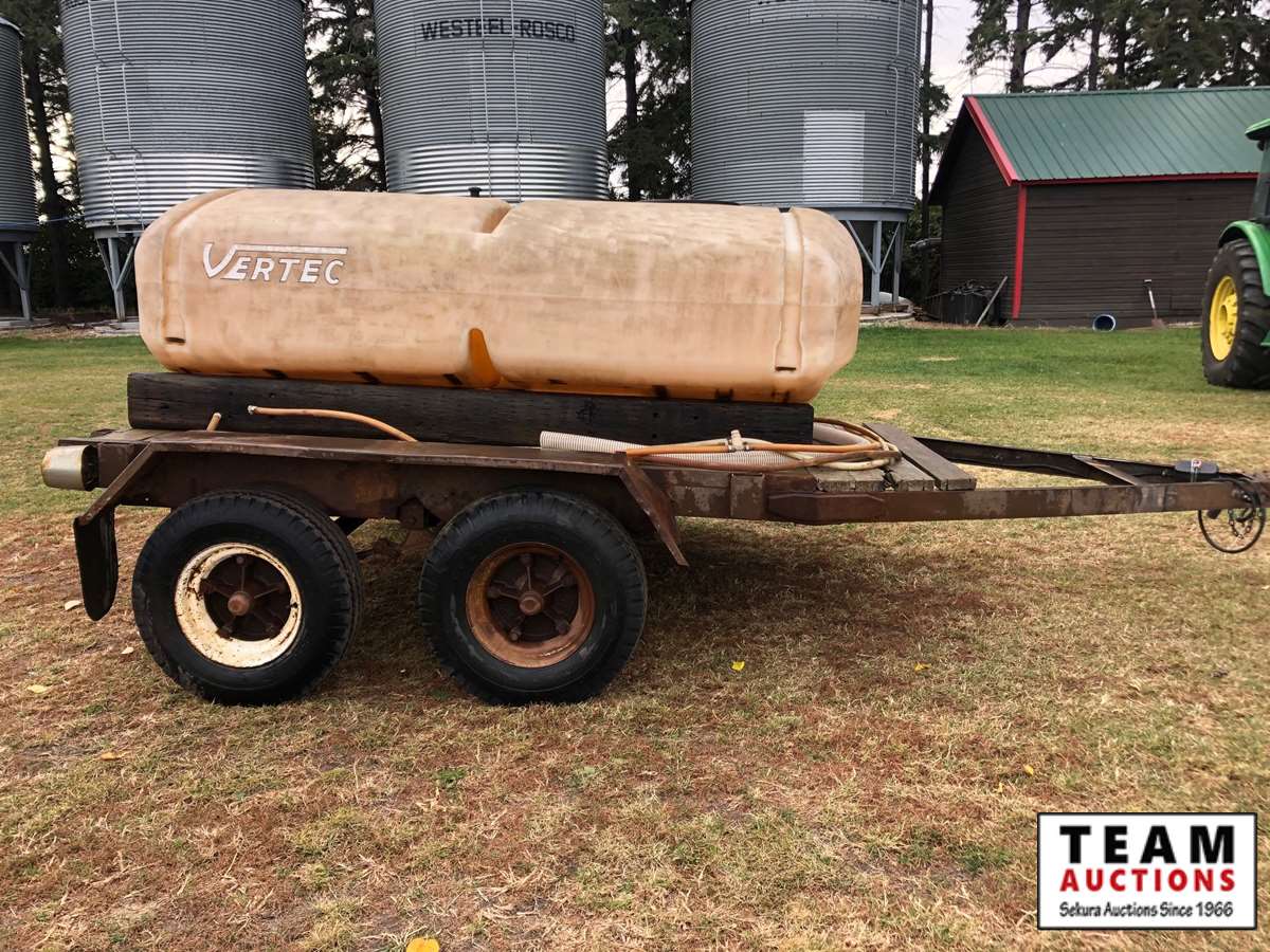 mobile home axles, Vertec 500 gal poly water tank, (2) railroad Ties, misc hose