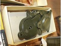 pencil sharpener, compass, army rations, eye glasses with case, rifle cleaner, Yale 1943 trunk lock set with key