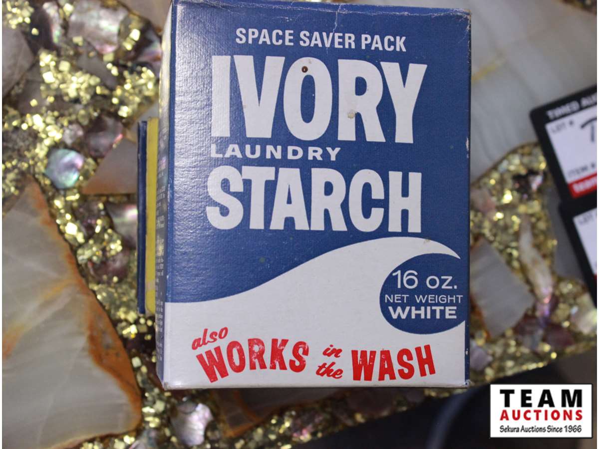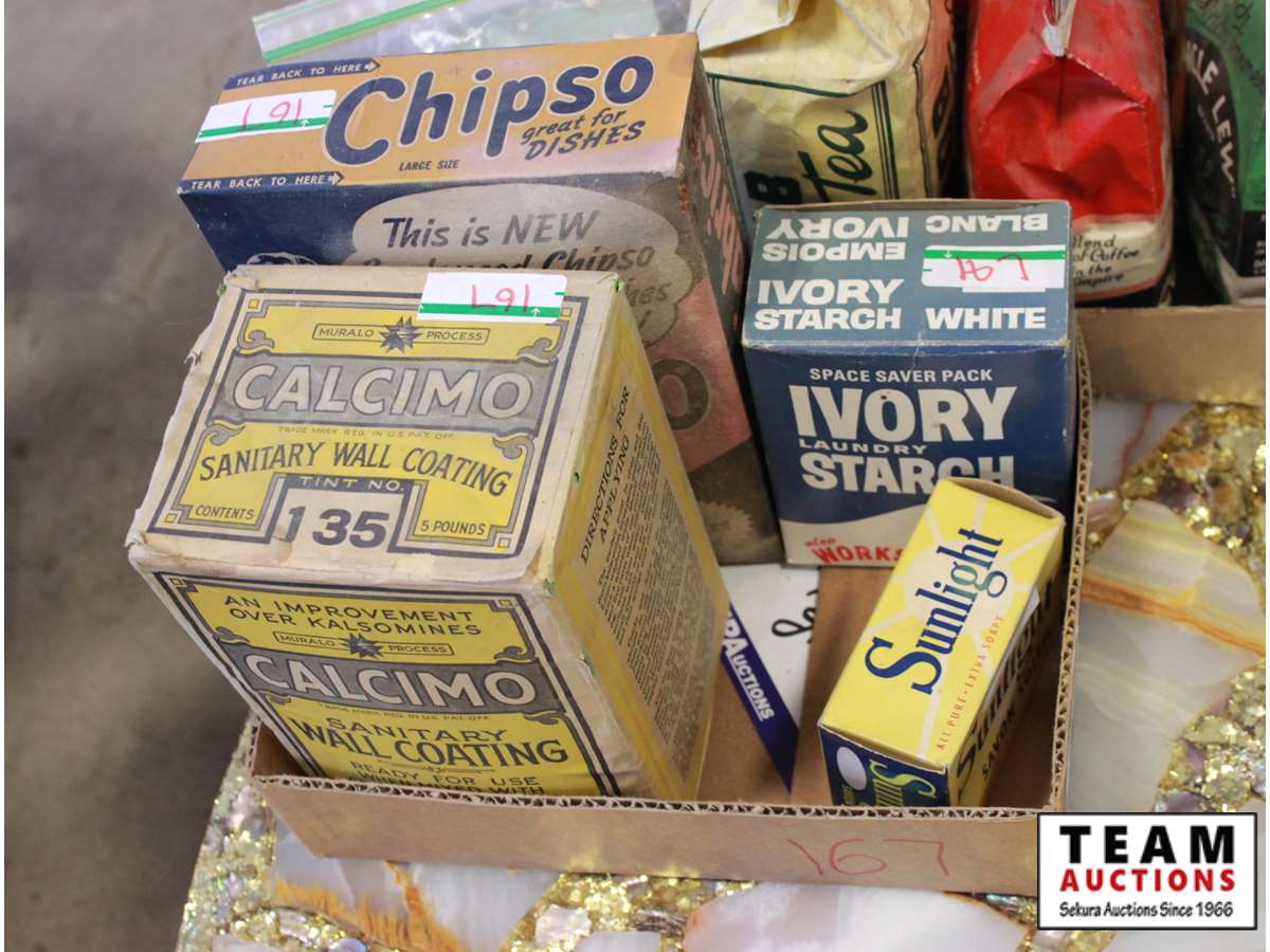 Ivory laundry starch, Sunlight bar of soap, Calcimo sanitary wall coating, Chipso dish soap