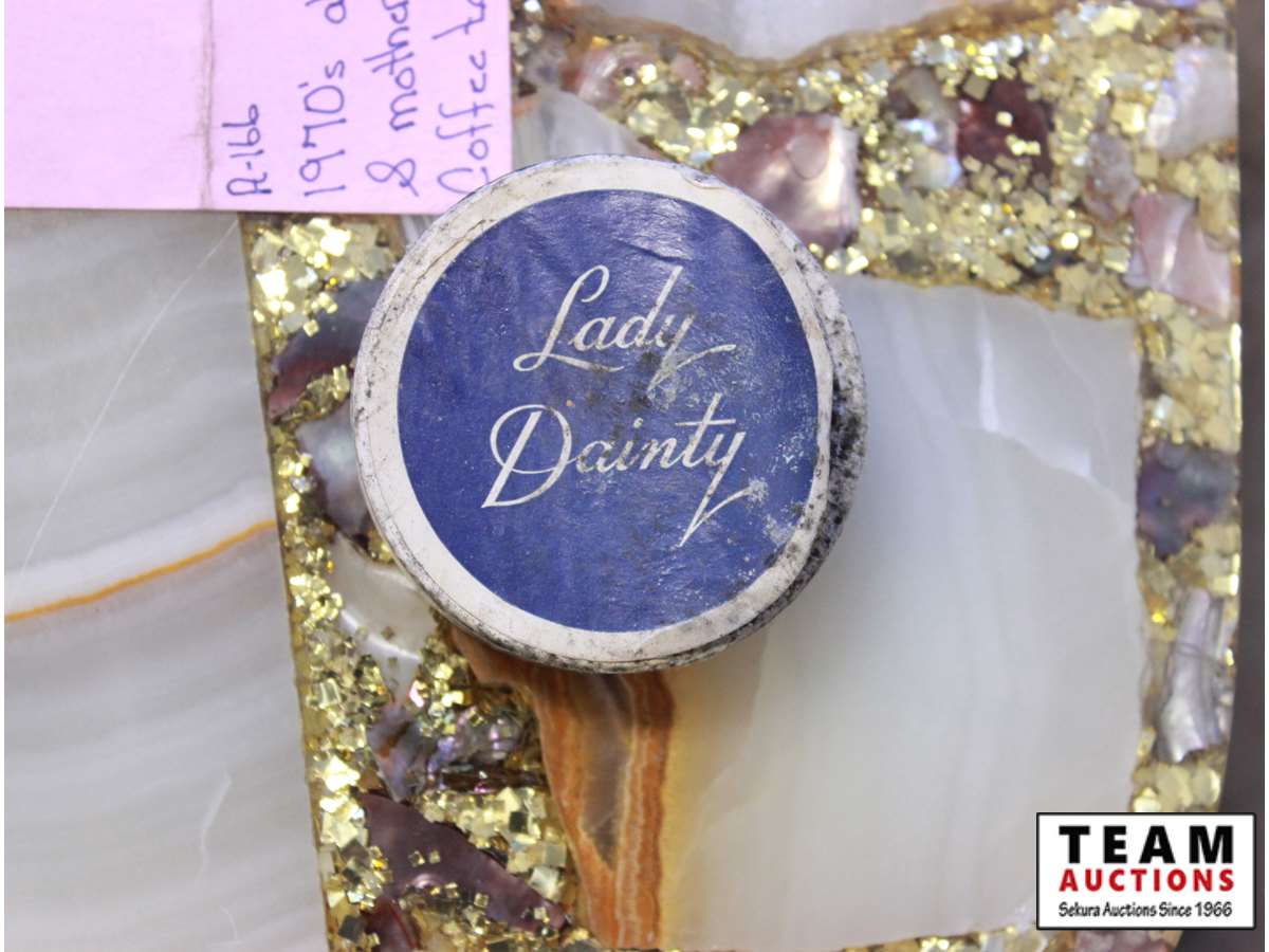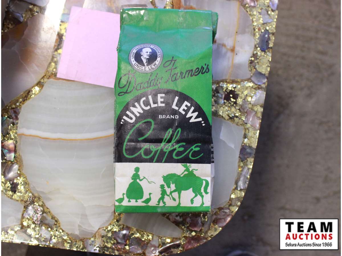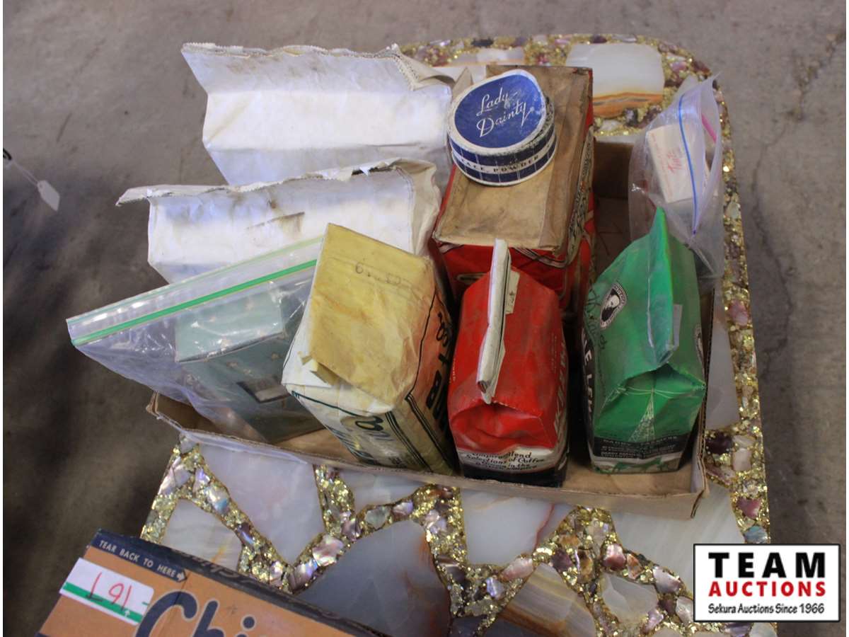 (2) Economy tea 1lb, Nabob green tea 1lb, Kilwa coffee 1lb, Daddy Farmers coffee 1lb, color shampoo & face powder, (2) Supper Souper menu # 5