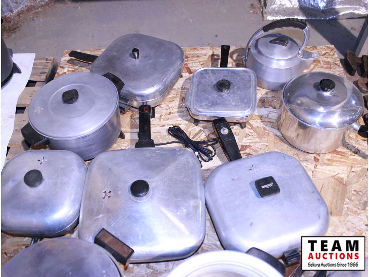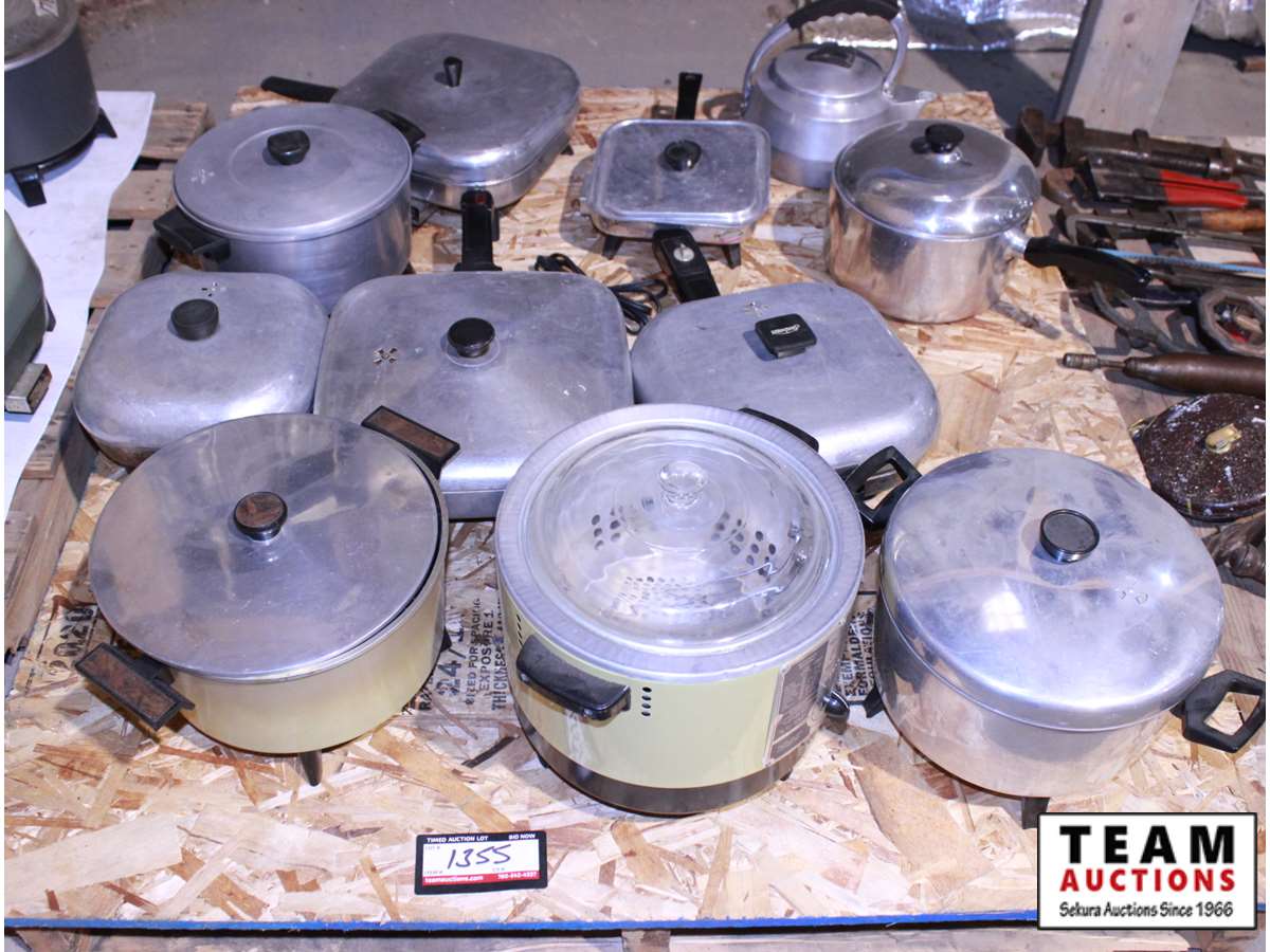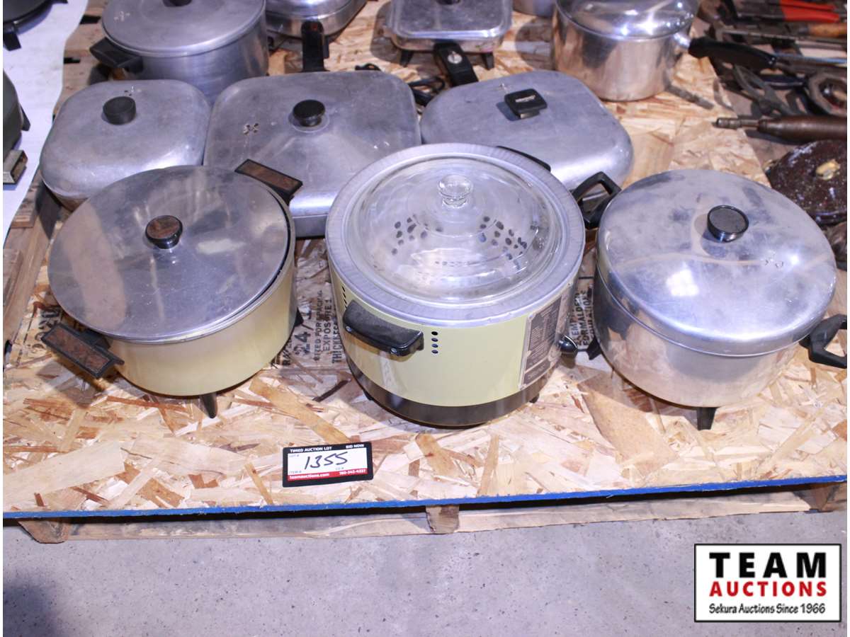 pallet of electric fry pans, deep fryer & pots with lids