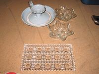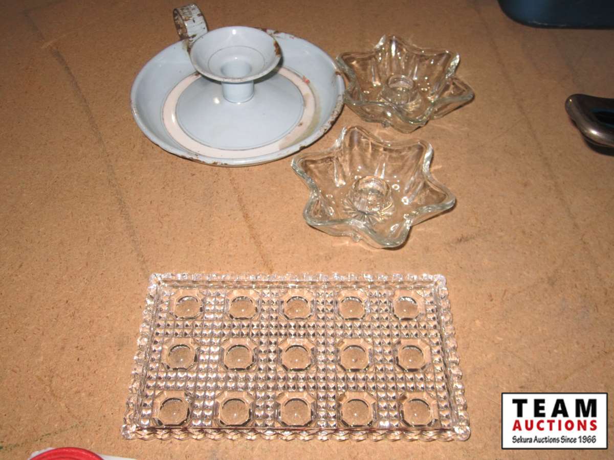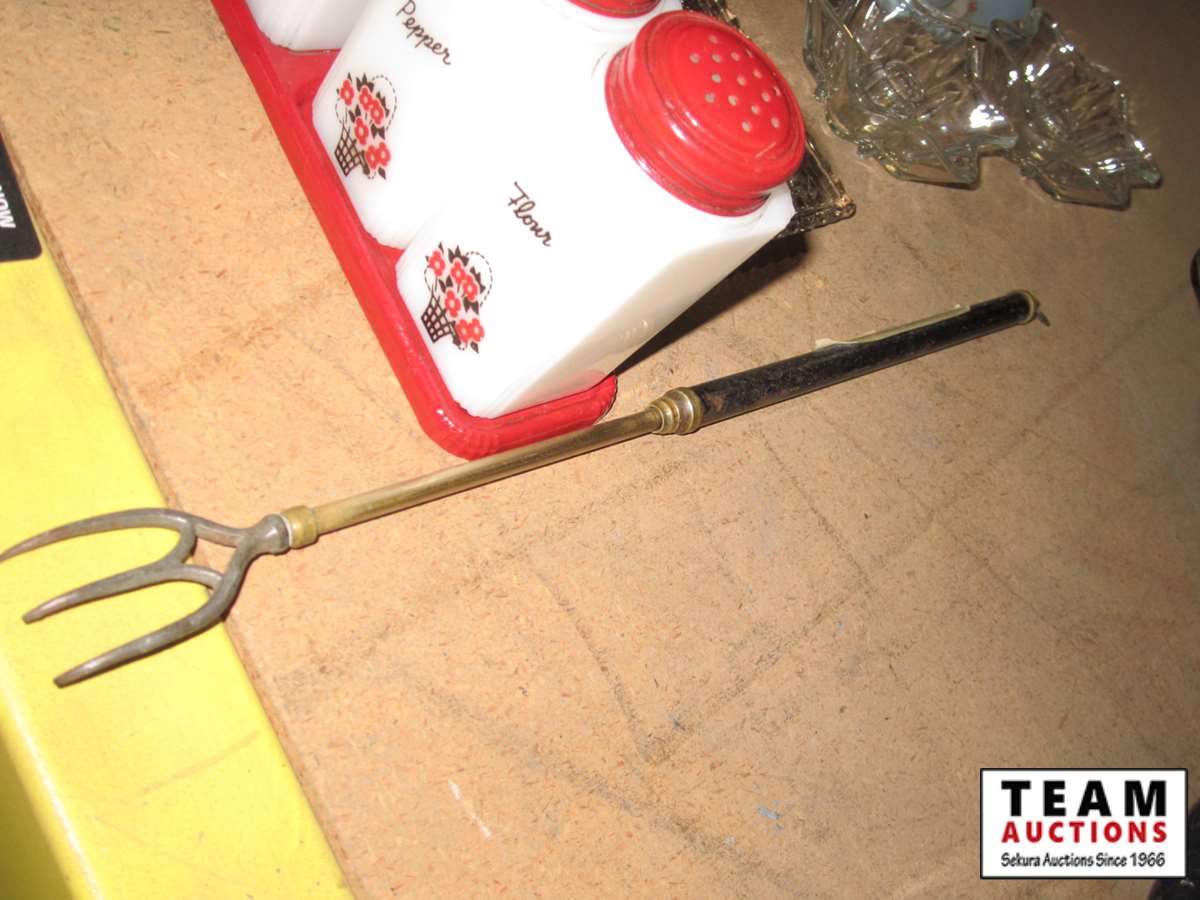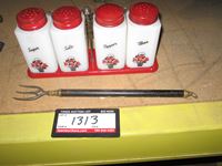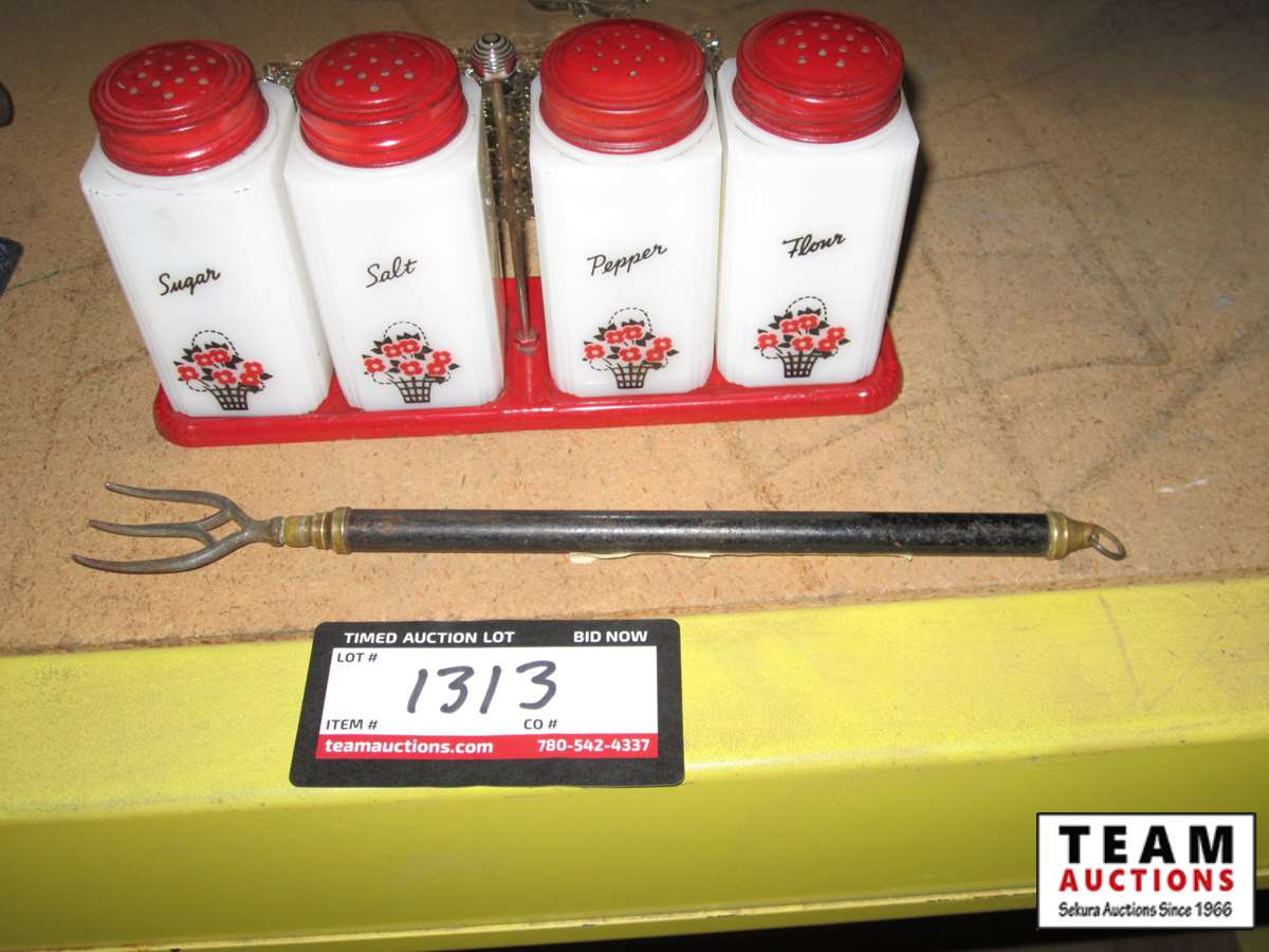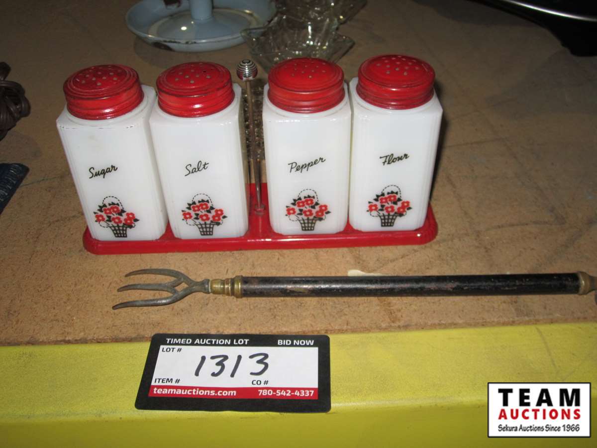 Milk Glass Sugar, Salt, Pepper, Flour Servicing Set & Toaster, Fork, Candle Holders, Glass Serving Dish