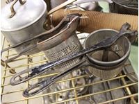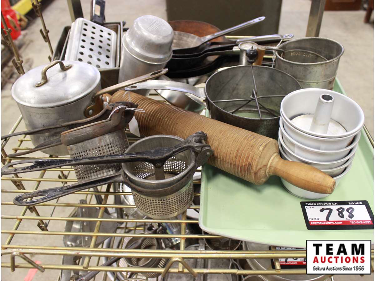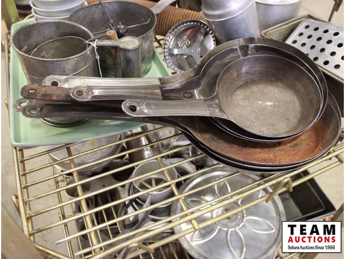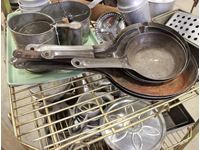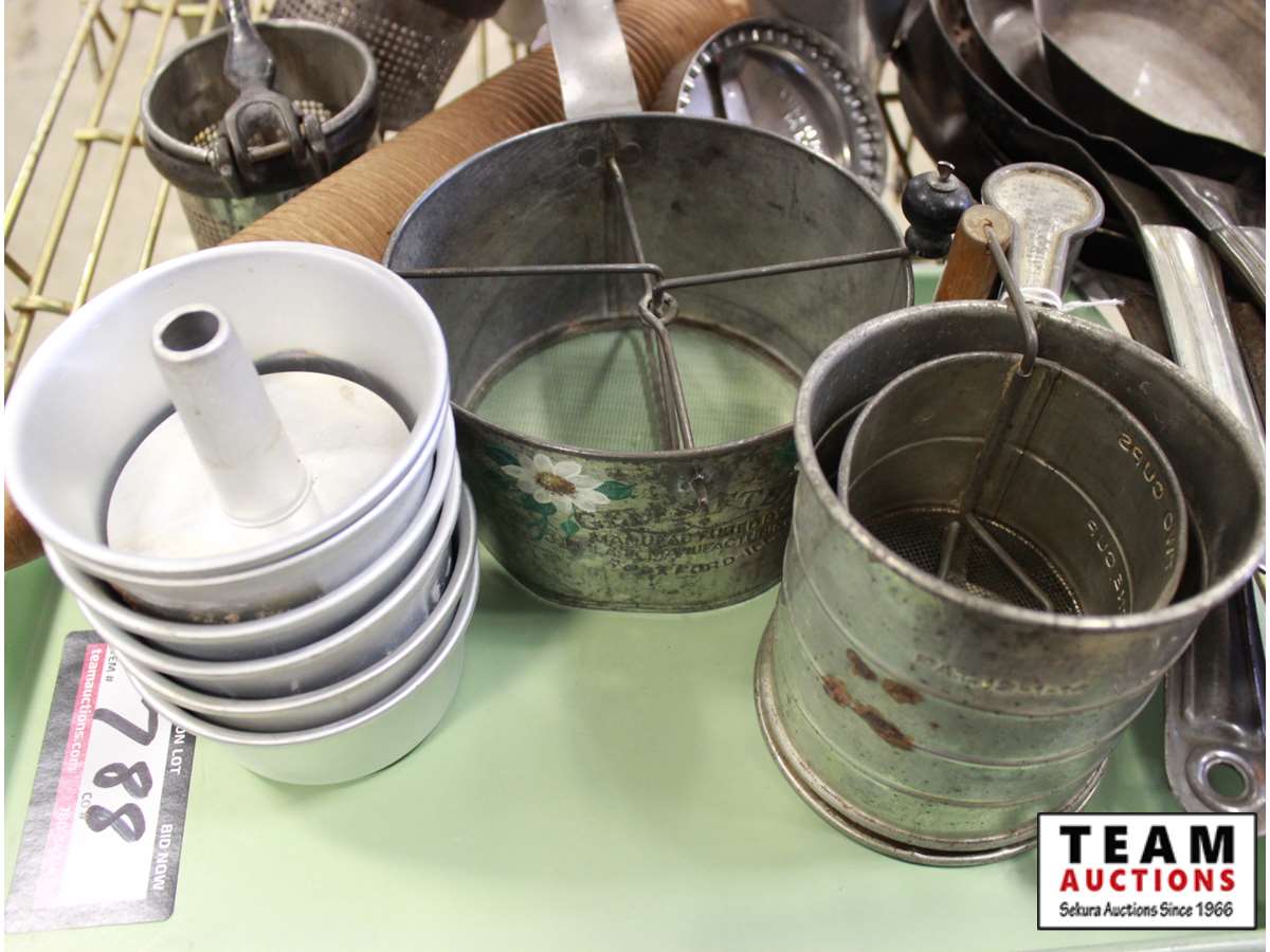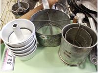 frying pans, flour sifters, bread pans, pot and rolling pin, small cake pans, juicers