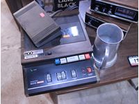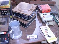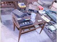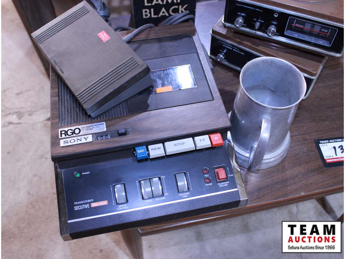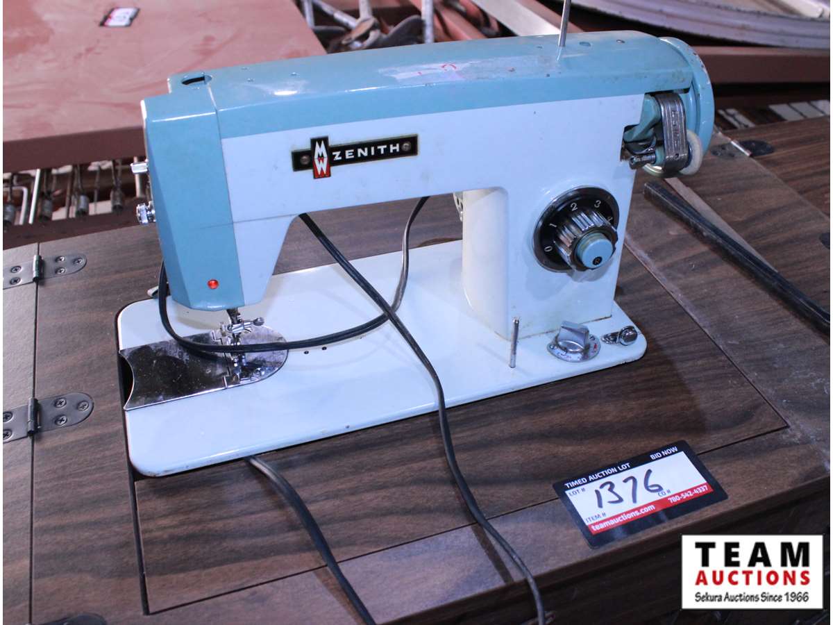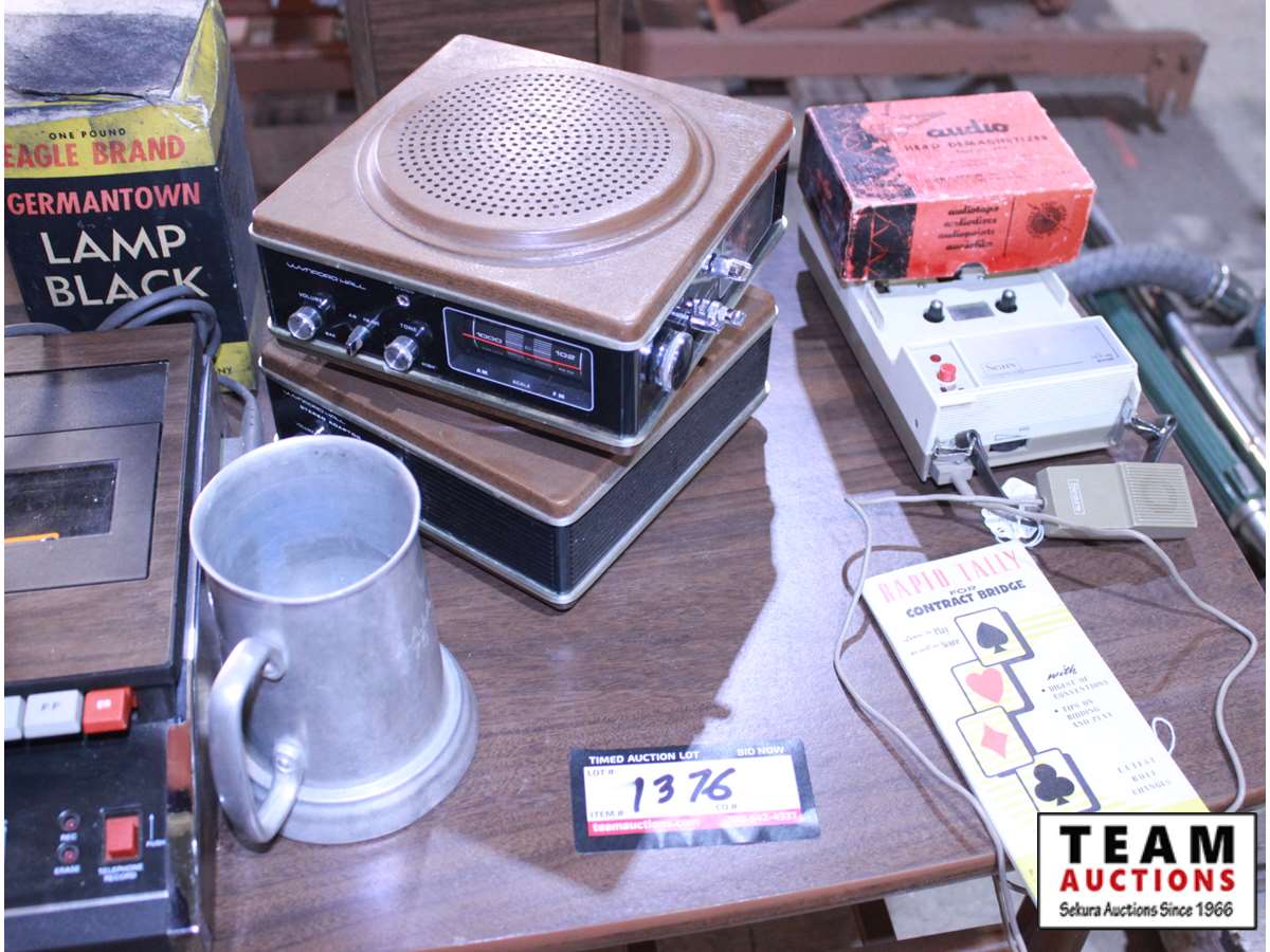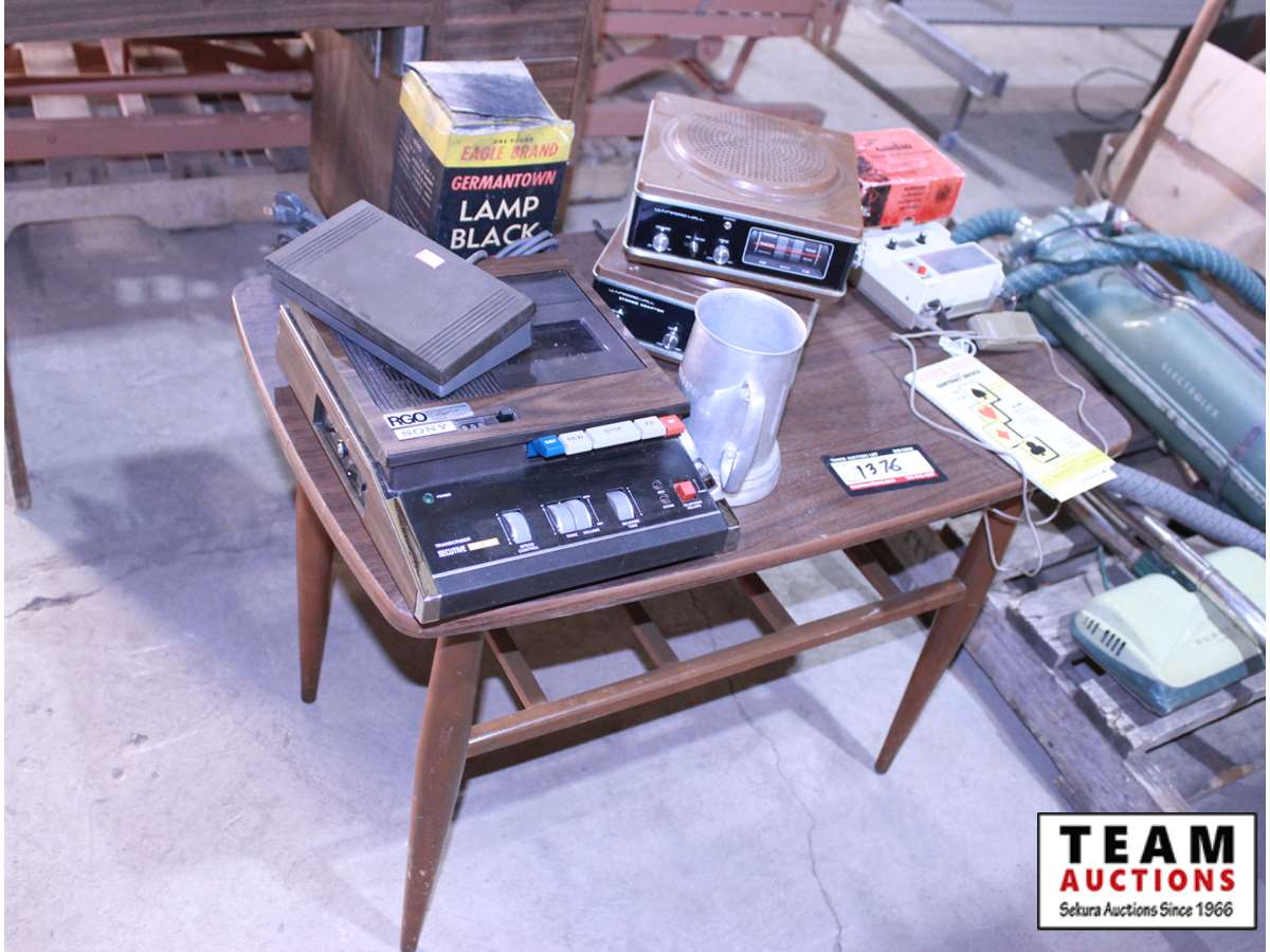 Zenith sewing machine, coffee table and Sony cassette transcriber, clock radio & misc.