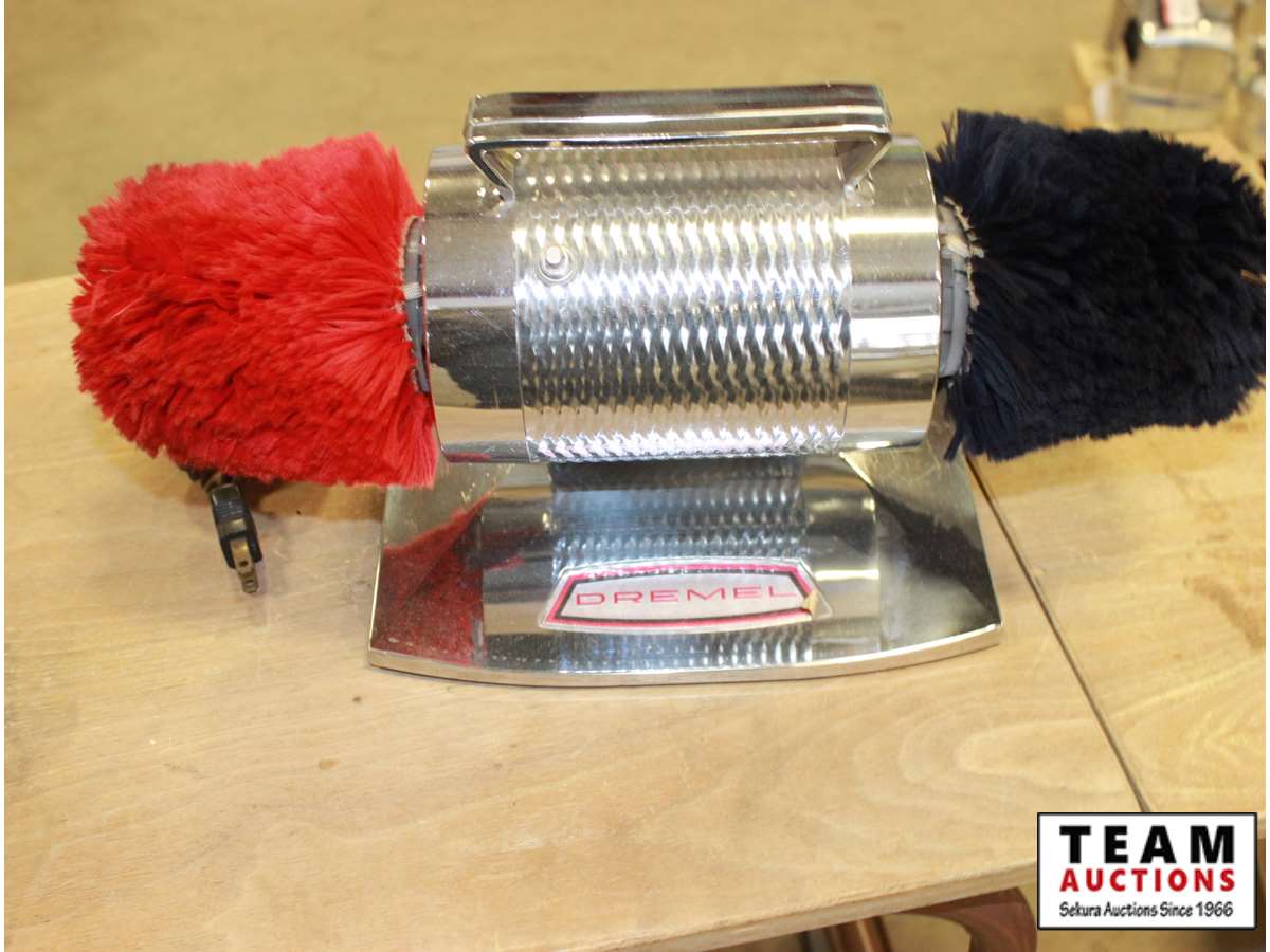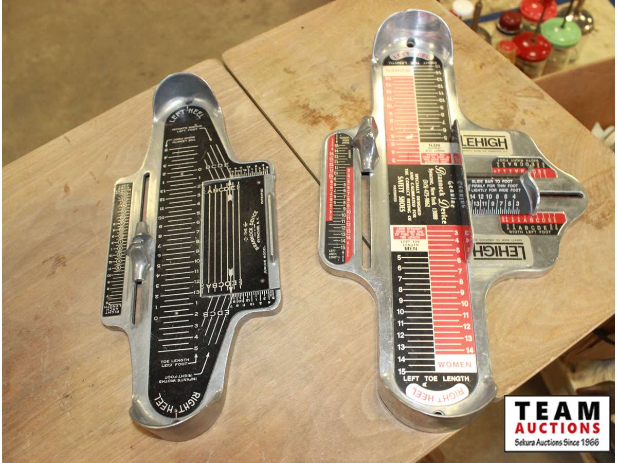 shoe fittings tool, electric shoe polisher (2) metal shoe sizers, wood shoe sizer, (4) shoe shine holder, (5) shoe repair lats, box of heels, box of misc polish