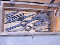 wood box with pick axe head, 2 axe head, misc hammer heads