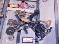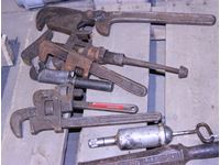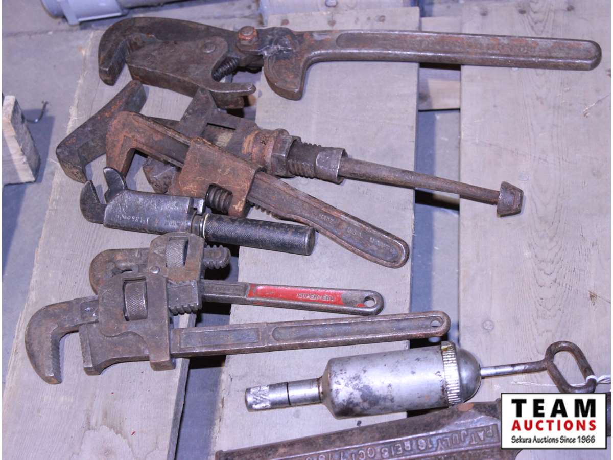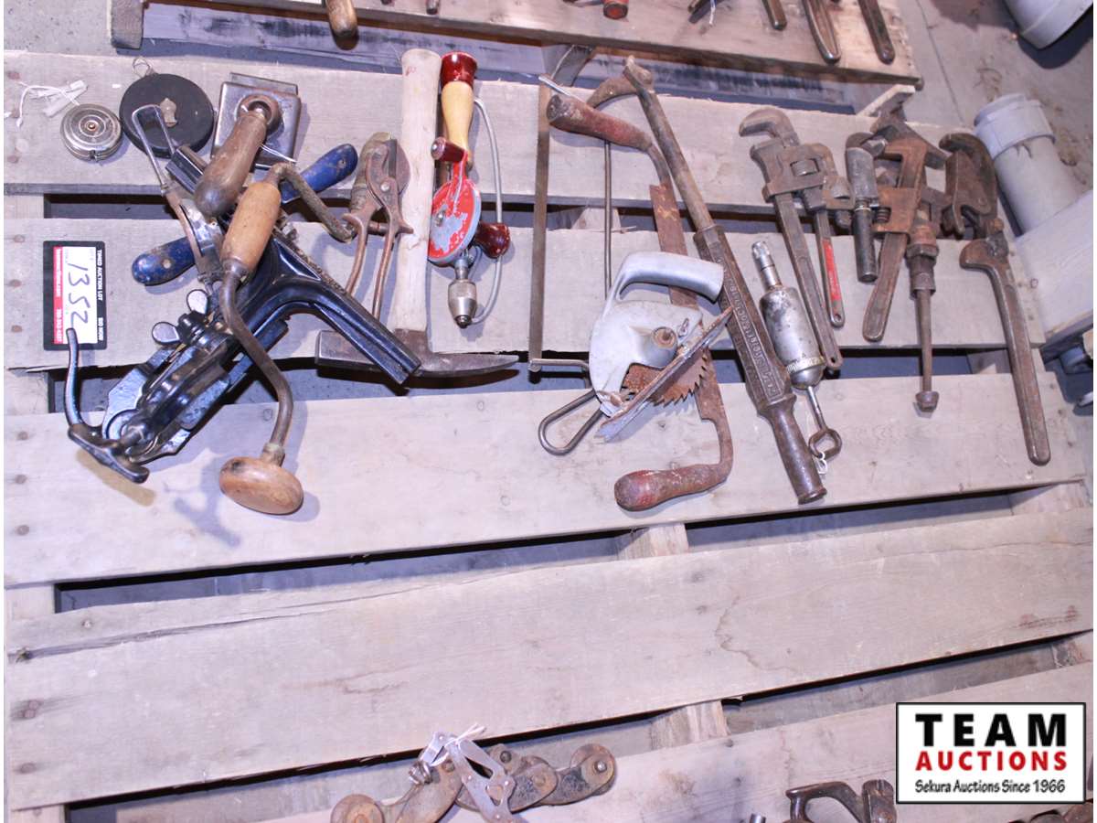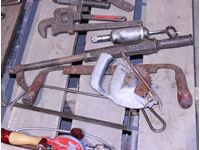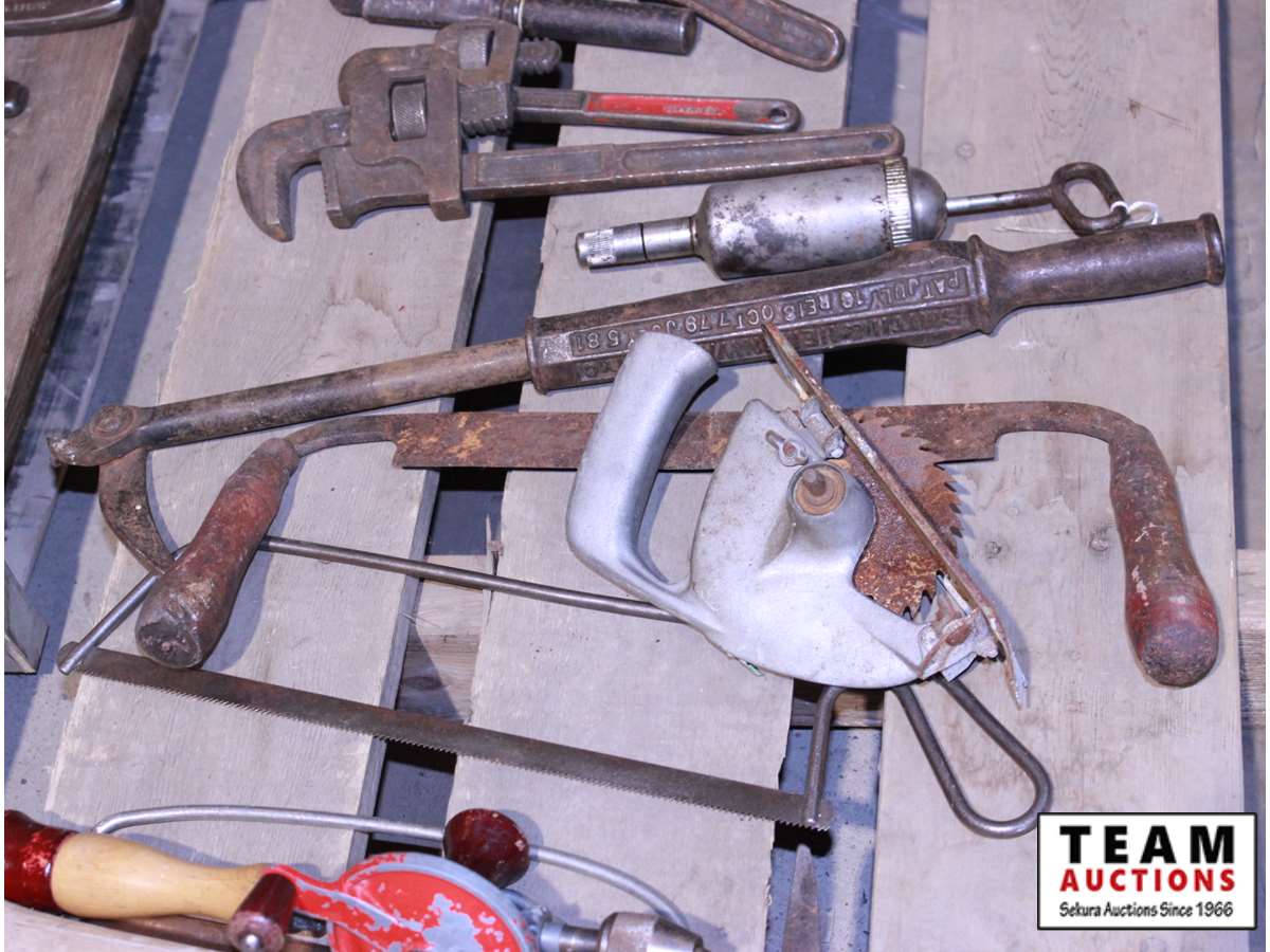 pipe wrenches, draw knife, saw sharping vise, hand drills, drill mount saw & misc. hand tools