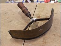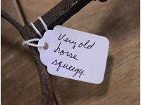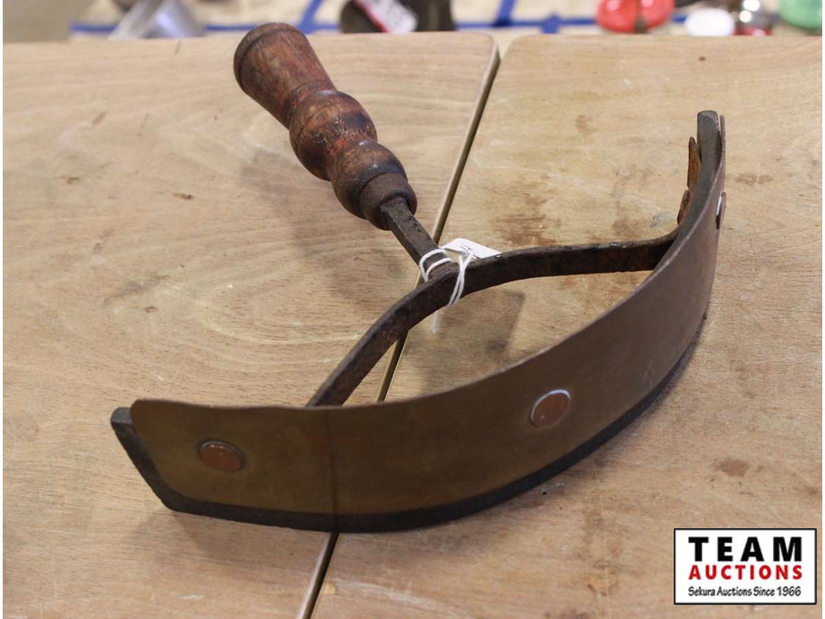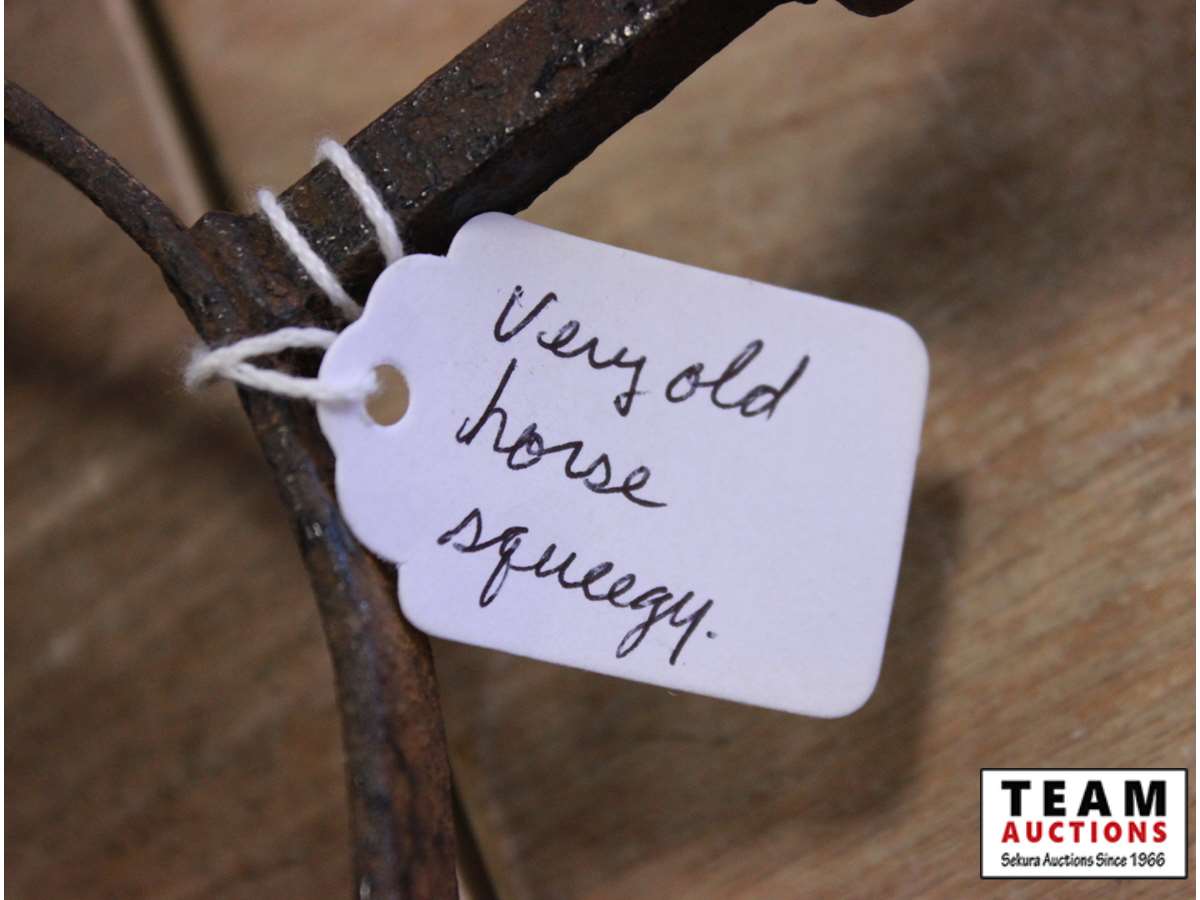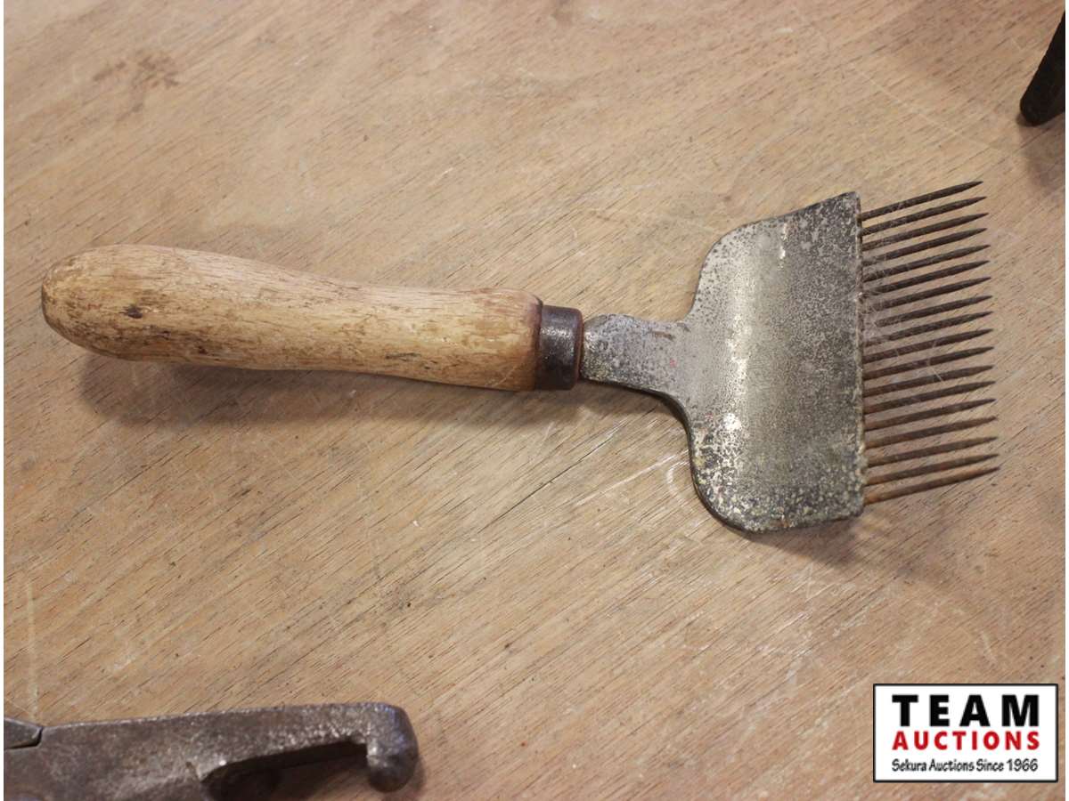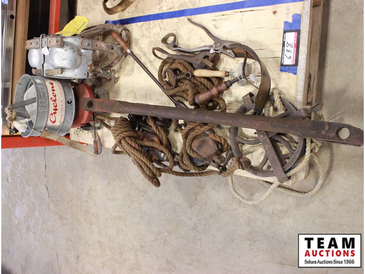 well pulley, (2) rope wire stretcher, wooden sickle pitman arm, horse tooth file, horse comb, horse squeegee, pig snouter, ear tag plier, nose lead, bull blinder with instructions, cyclone seeder