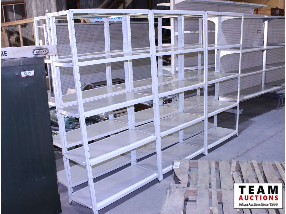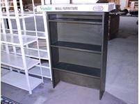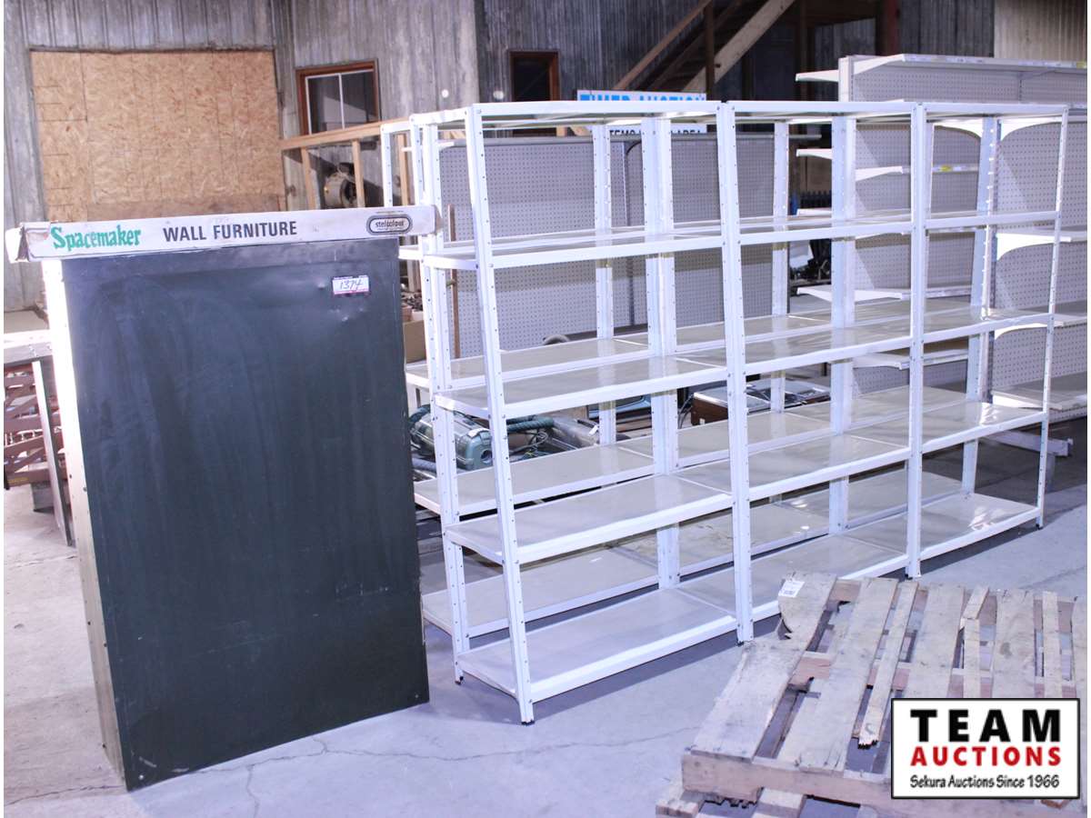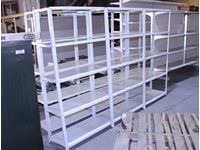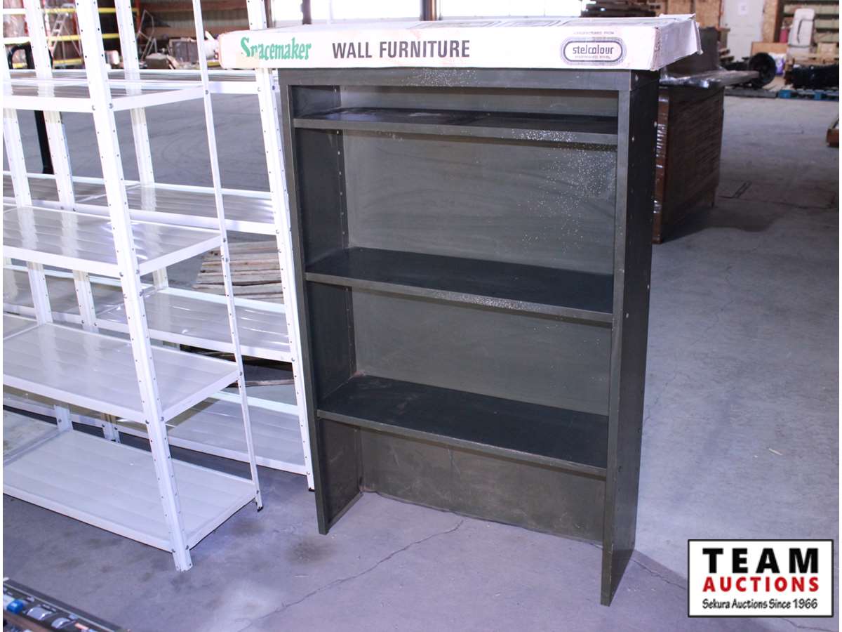 (2) lite duty shelves, (1) shelf unit green, (1) new in box shelf unit