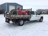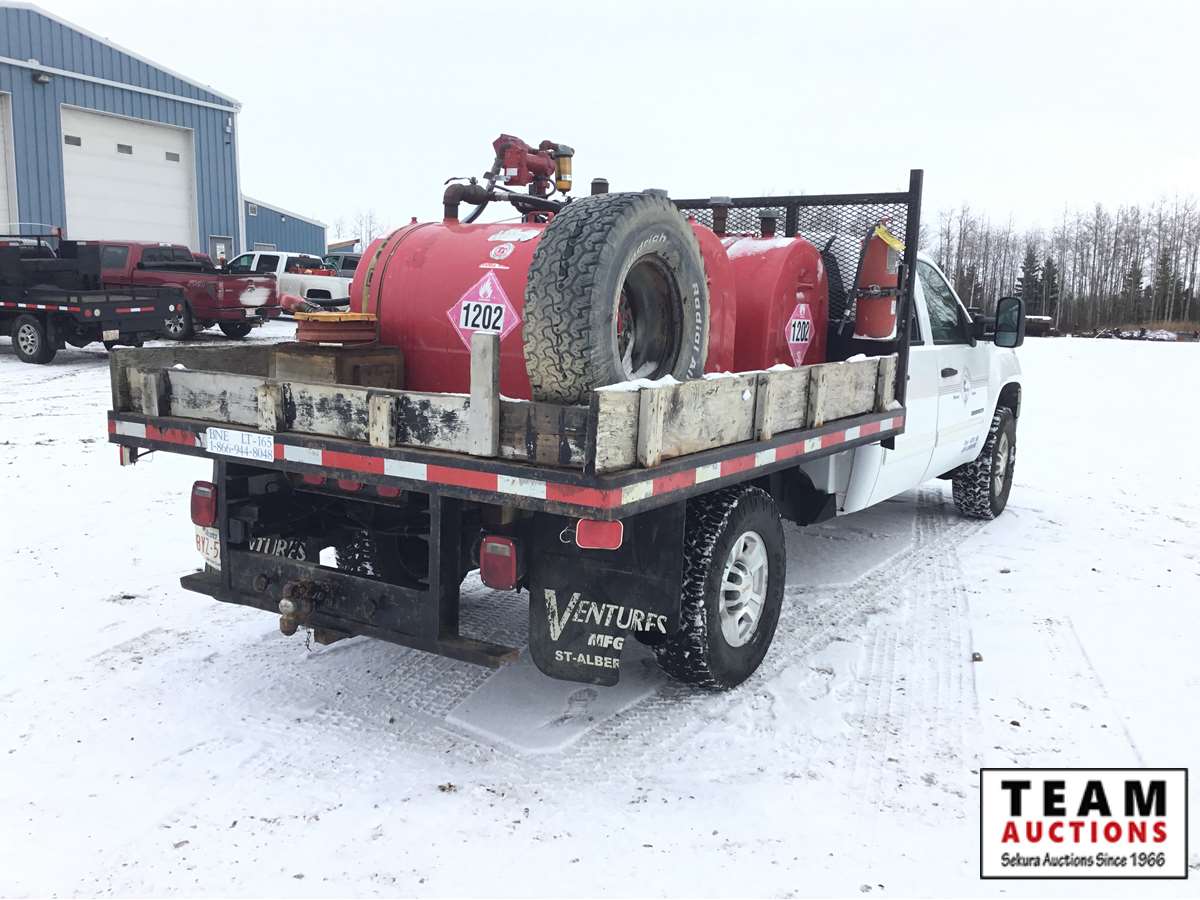 V8 gas engine, auto transmission, deck with tool boxes, trailer tow package, rear single wheels, twin 750 litre double wall fuel tanks with Fill Right 12 V pump, hose reel, auto shut off nozzle, ground cable for bulk loading, Alberta registered, 224,692 kms