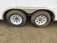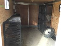 small front office, plywood lined, storage compartments, air conditioning, rear swing out doors, side man door, wired for 110 V, 3000 lb axles, spare, Alberta registered