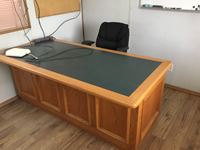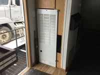 open entry way, end office, bathroom, water storage, water heater, pressure system, very nice office furniture, fridge, propane furnace with tank, AC unit, front steel stair and deck area
