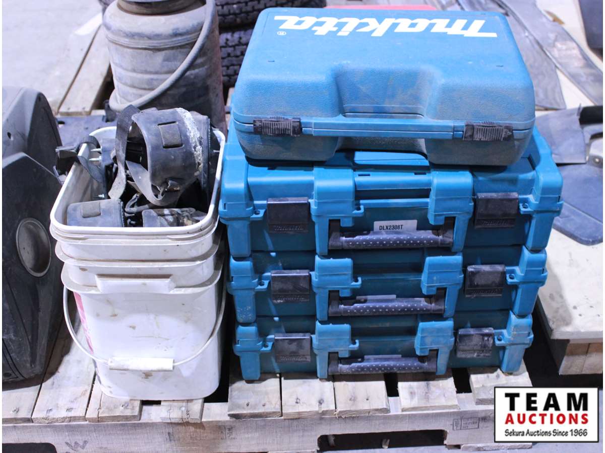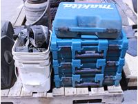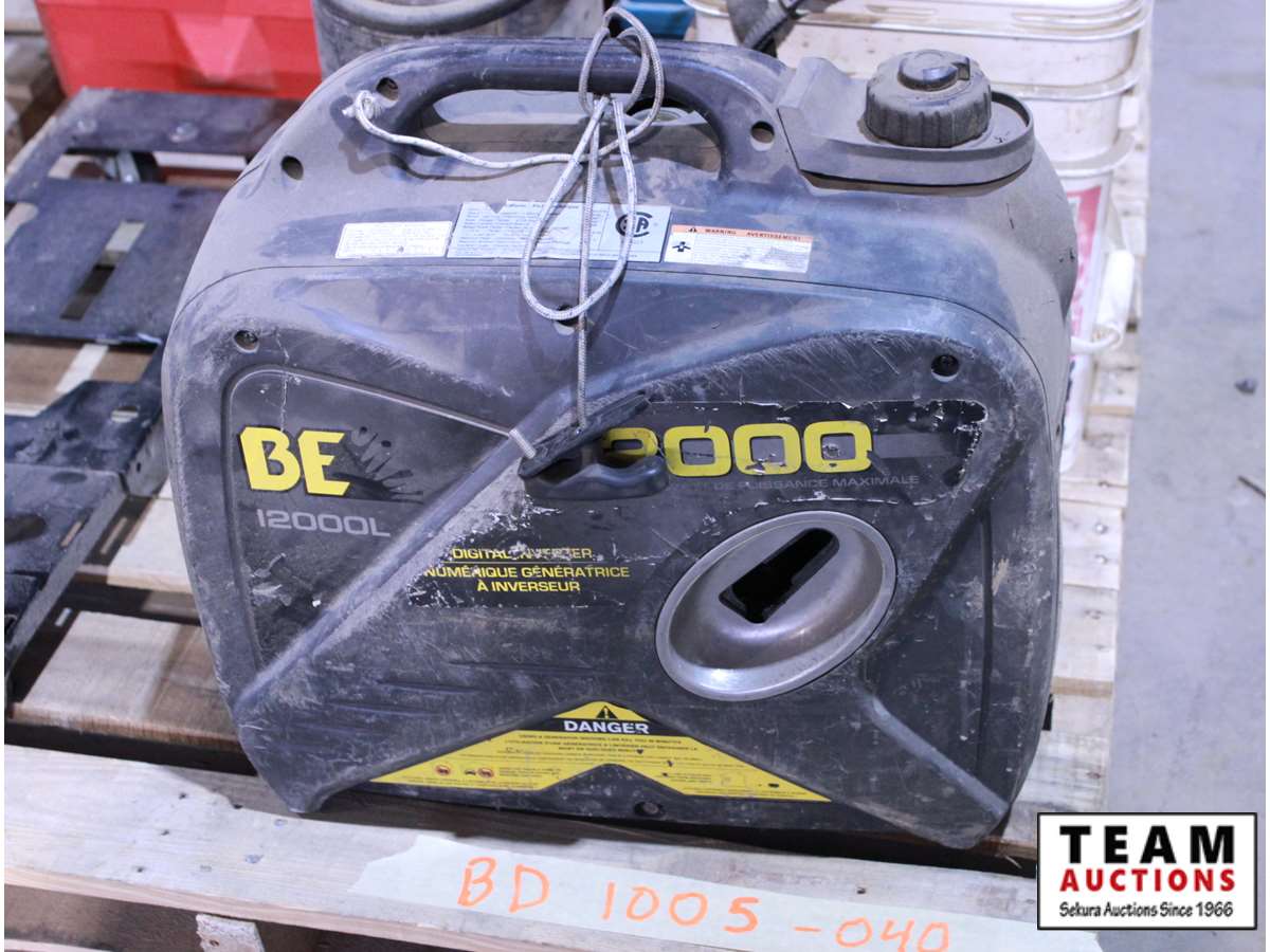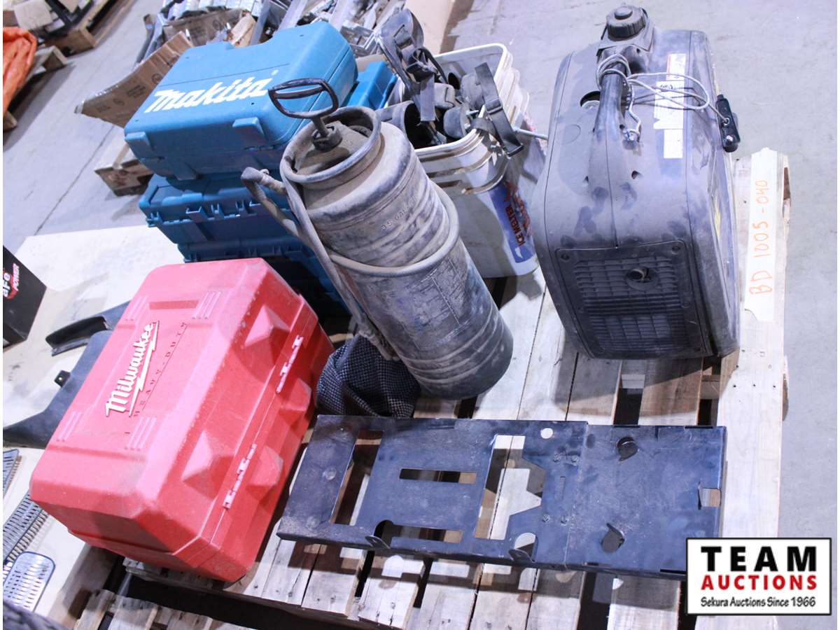 B.E. 2000 inverter (pull cord needs repair), strap on boot spikes, (4) empty Makita cases, empty Makita case red, sprayer