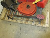 (4) wheelbarrow tires with rims, (3) 1 gal jerry cans, fire extinguisher bracket, twin cyl air compressor head, HD gear reduction box, large chain pipe wrench