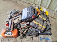 battery charger, choker, squares, tool belt, drills, buffer, jacks, sander & lights