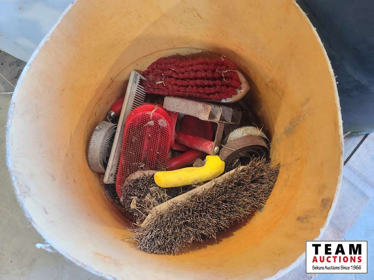 1500 (2) Tubs of Old Horse Tack & (1) Tub Misc Brushes