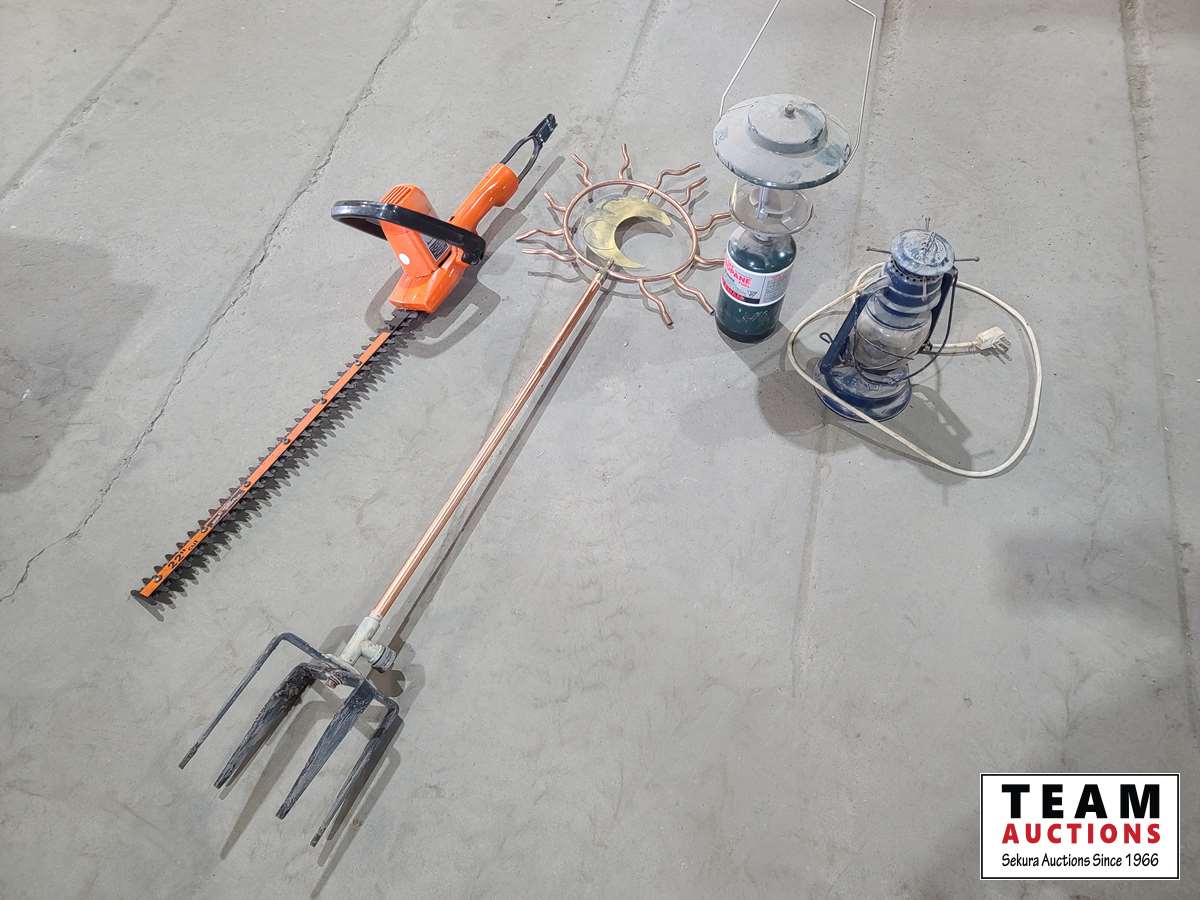corded hedge trimmer, (2) lanterns, sprinkler