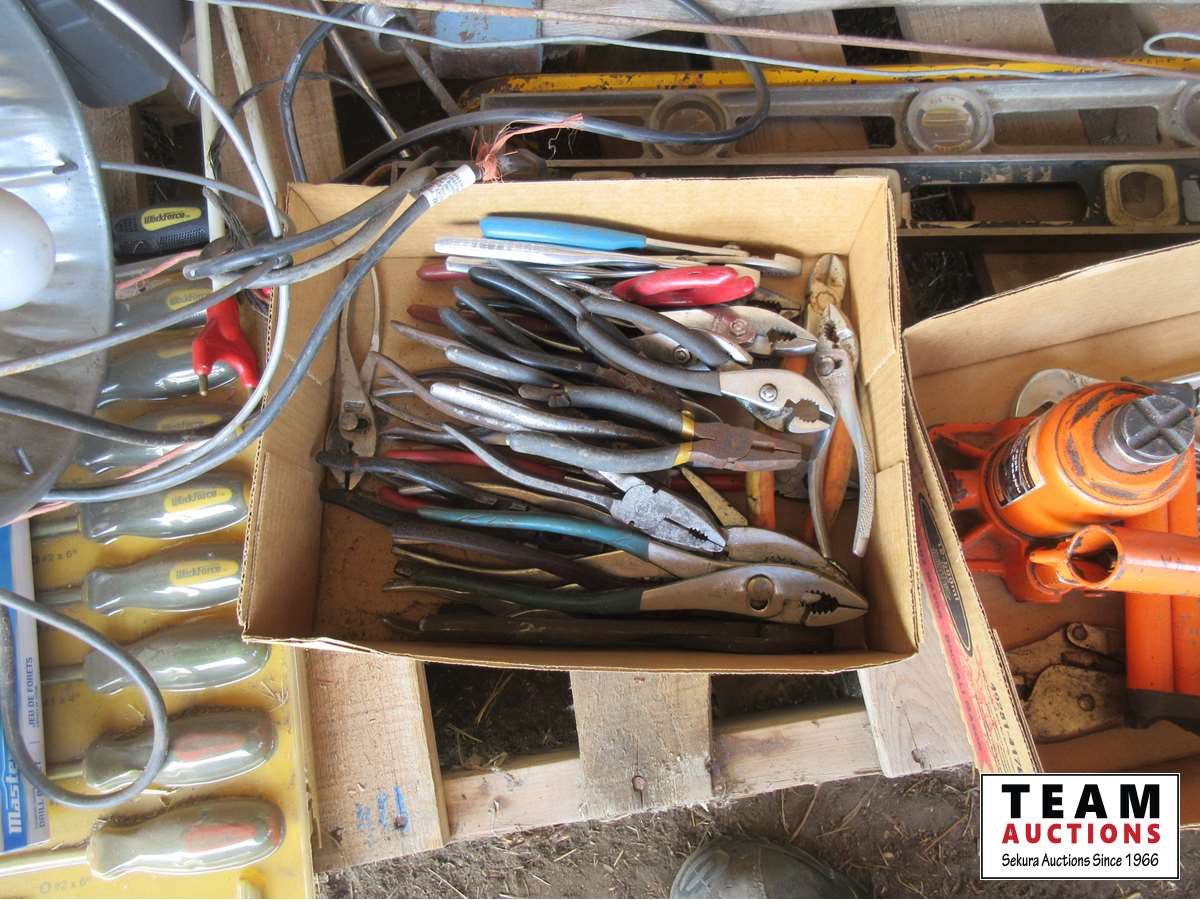 Screwdrivers, levels, pliers, adjustable wrenches, 4 ton bottle jack, cattle prods, 200 ft tape, drill bit set, carpenter belts, miscellaneous