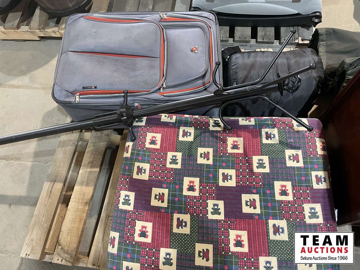 Suitcase, coat hanger, kids mattress, sleeping bag