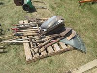 1818 Pallet of Shovels, Potato Fork, Rake, Spades