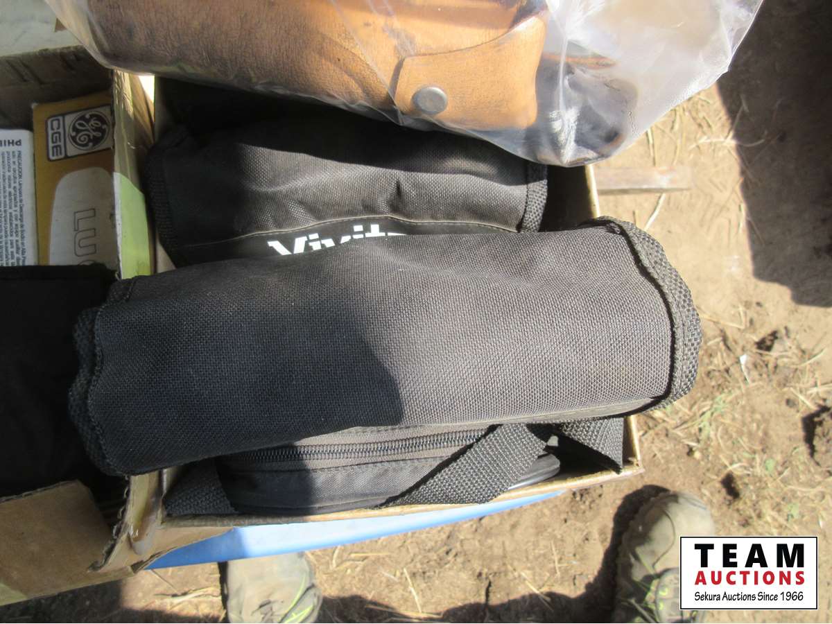 Trowels, box of binoculars, soaker pads, pry bar, small Makita drill