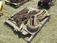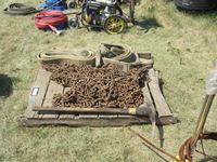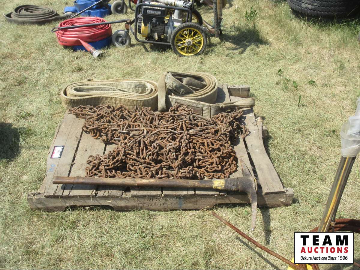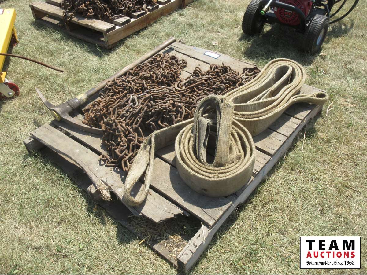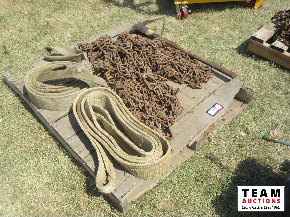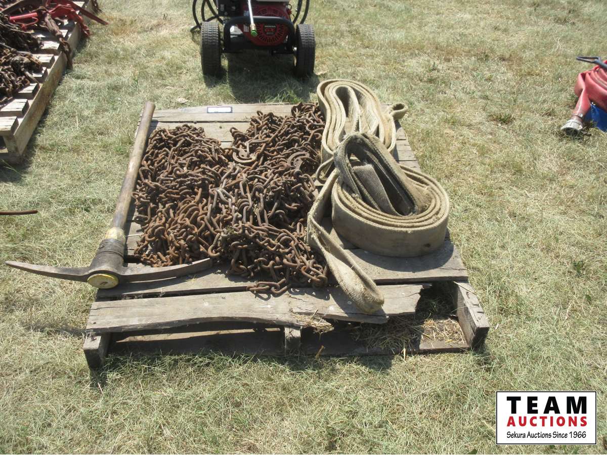 1831 Pallet of Truck Chains, (2) 4 Inch Slings & Pick Axe