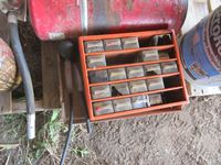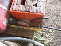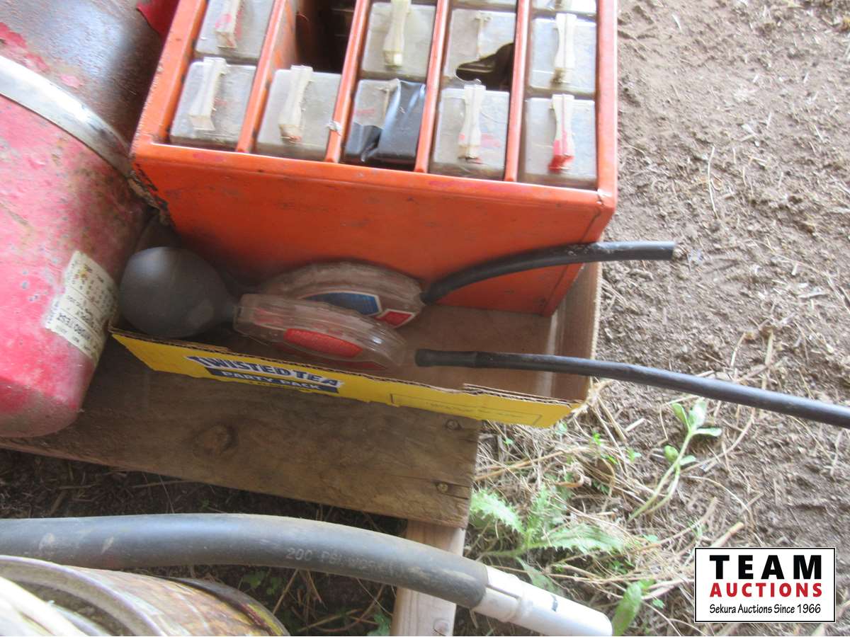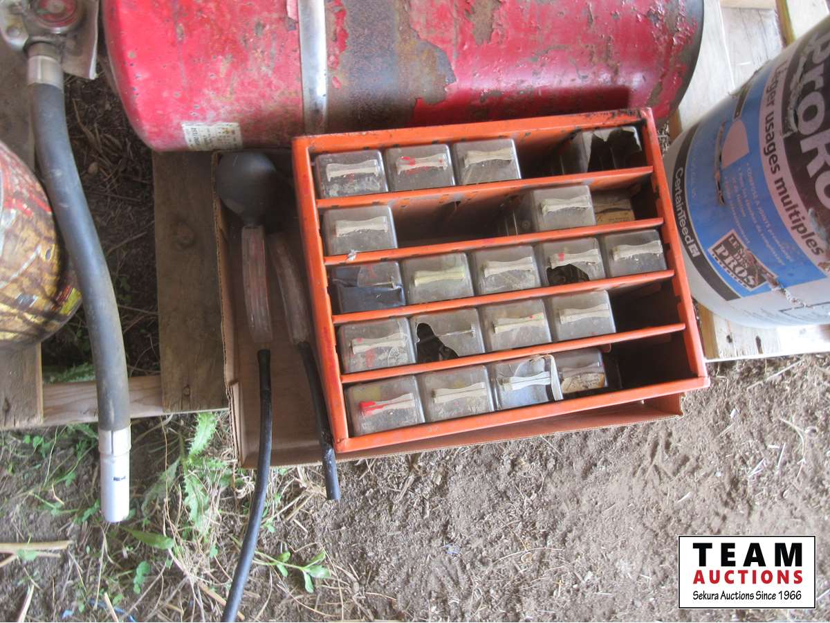 Poly hose roll, (25) drawer parts cabinet, (2) antifreeze testers, fire extinguisher, bucket of nails