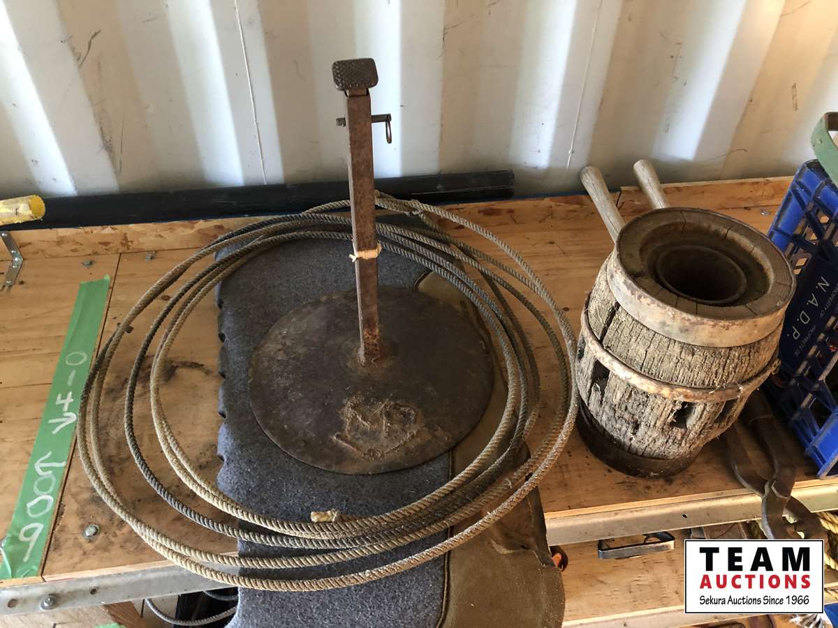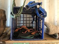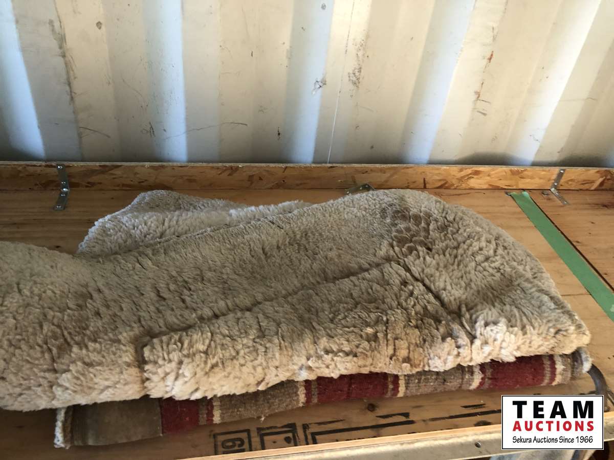 (3) Saddle blankets, lariat, hoof stand, wagon wheel hub, hoof trimmers, box of halters