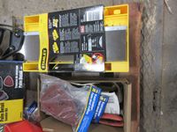 palm sander and pads, manual mitre saw, large quantity of od wood biscuits, (2) sets of router bits, 3/8 air hose, texture gun, stud finder and miscellaneous items