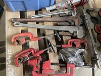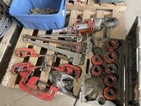 Rigid 700 power threaders, fall set of threader heads, 0 inch -4 inch cold cutters, 0 inch -2 inch cold cutters, 36 ft pipe wrenches, 24 inch aluminum pipe wrench, 2 bins full of chains, slings and come along